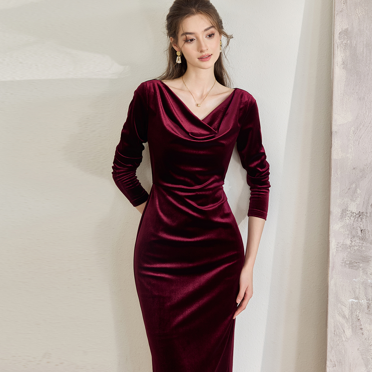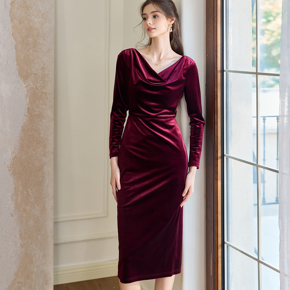 罗衣高级丝绒修身连衣裙2025秋冬新款复古安可拉红婚宴裙子11161