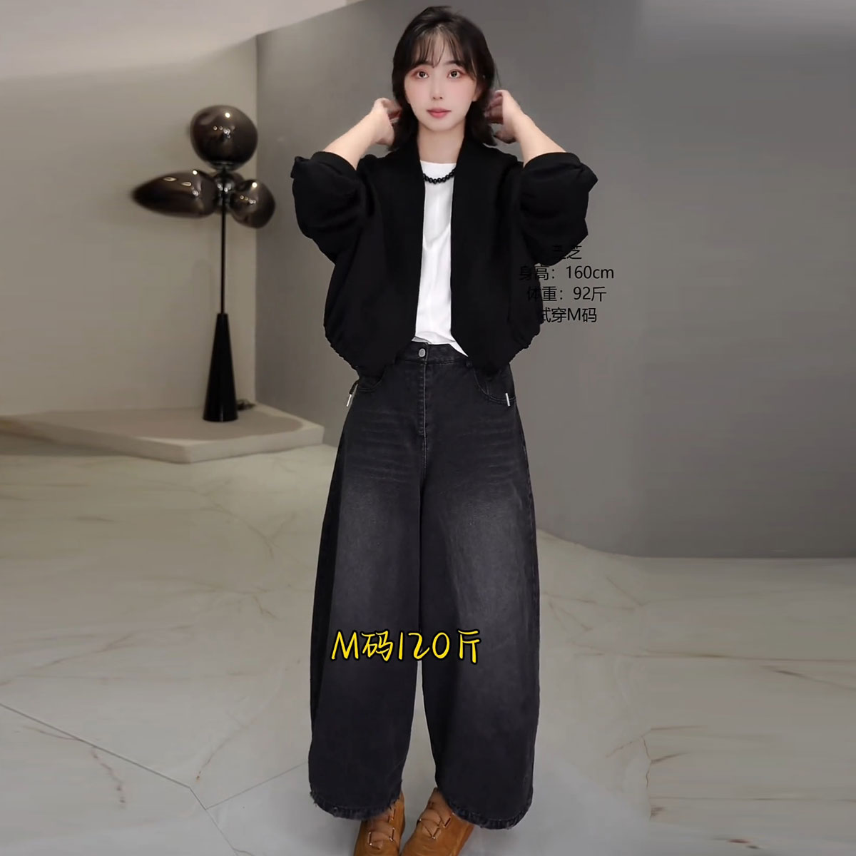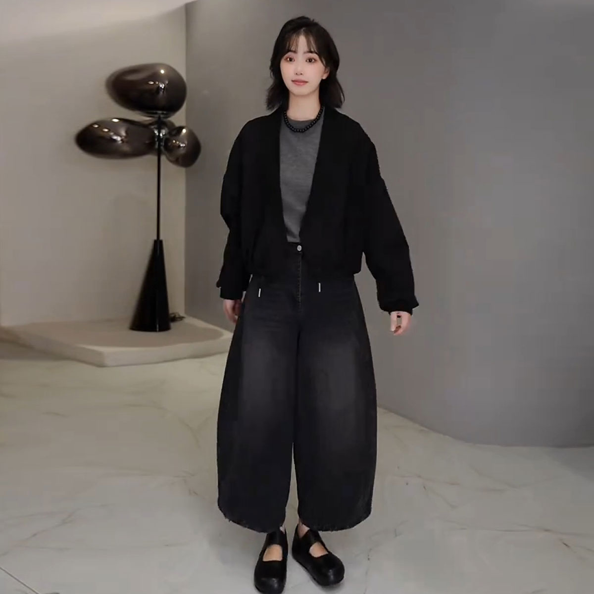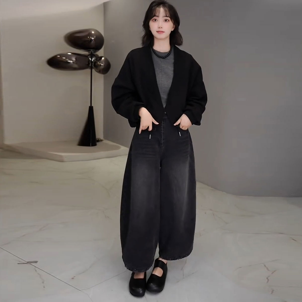 大码时尚套装女2025秋装V领收绳短外套上衣+水洗牛仔弯刀裤两件套