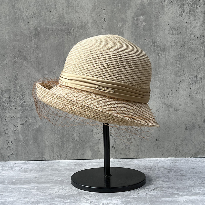 法式复古网纱卷边礼帽女夏季草编遮阳帽子优雅时尚渔夫帽女士草帽