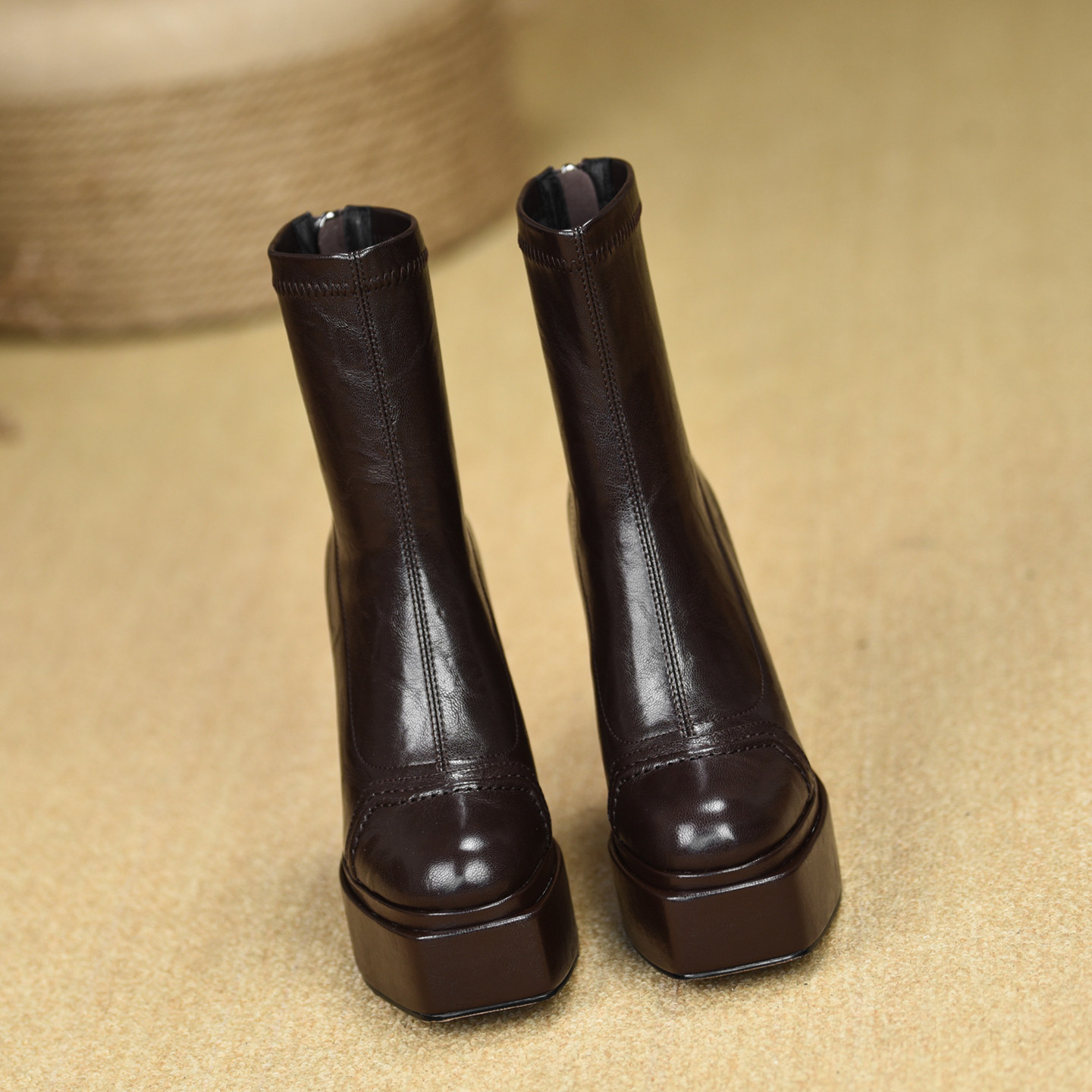 misili~12.5cm 显瘦弹力靴粗跟短靴2025秋冬新款高跟鞋厚底女靴子