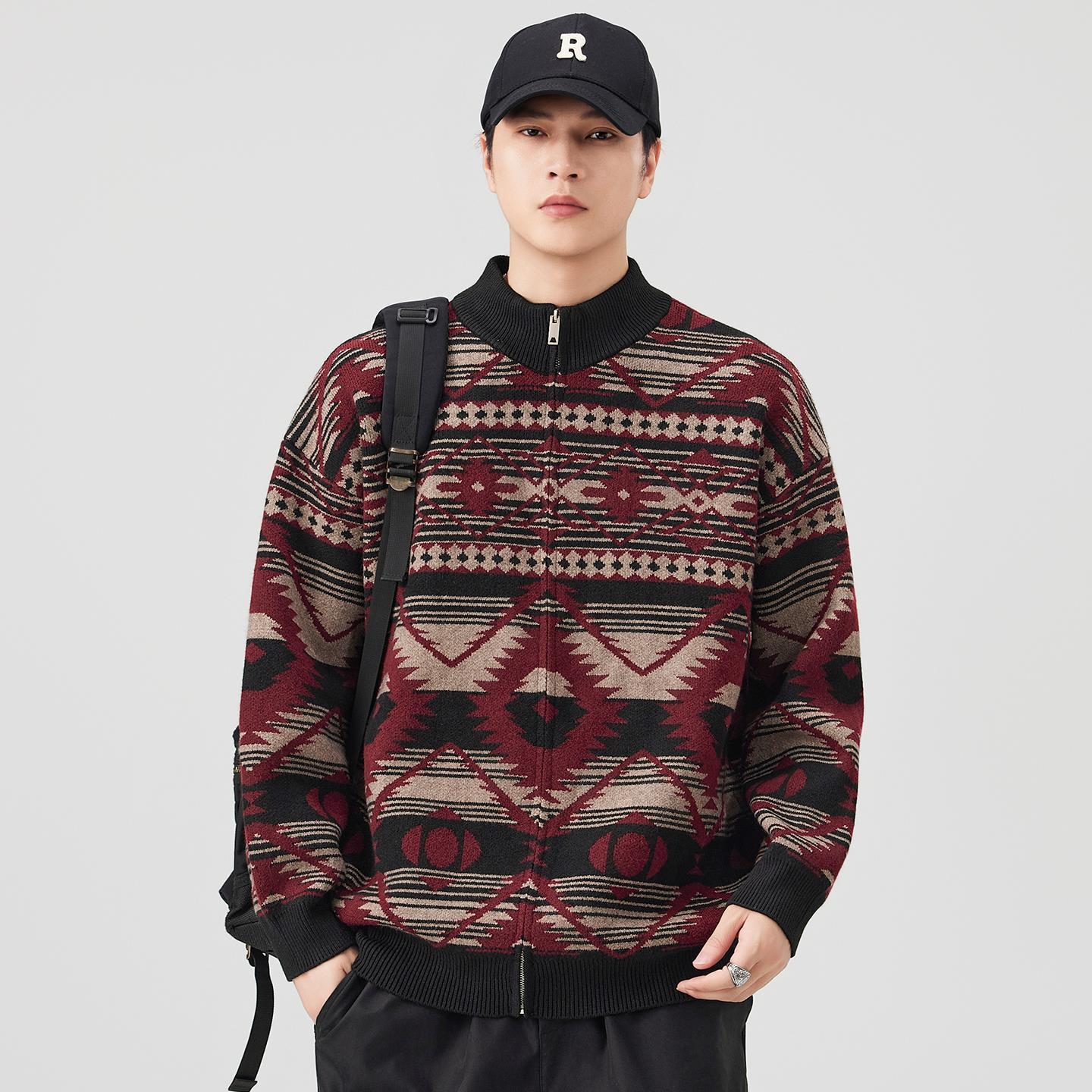 以纯秋冬季提花拉链开衫外套男针织衫立领宽松日系百搭毛衣潮