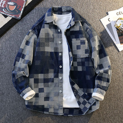 长袖牛仔衬衫男2025新款春秋季格子港风外套男潮牌休闲衬衣夹克衫