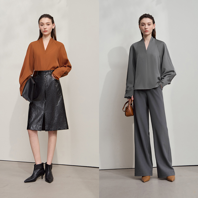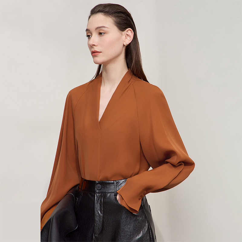 Amii2025秋新款优雅通勤风V领插肩袖雪纺衫女宽松收褶垂感上衣