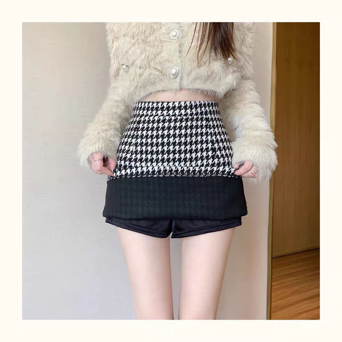 千鸟格半身裙大码松紧高腰毛呢包臀一步裙冬胖MM百搭显瘦a字短裙