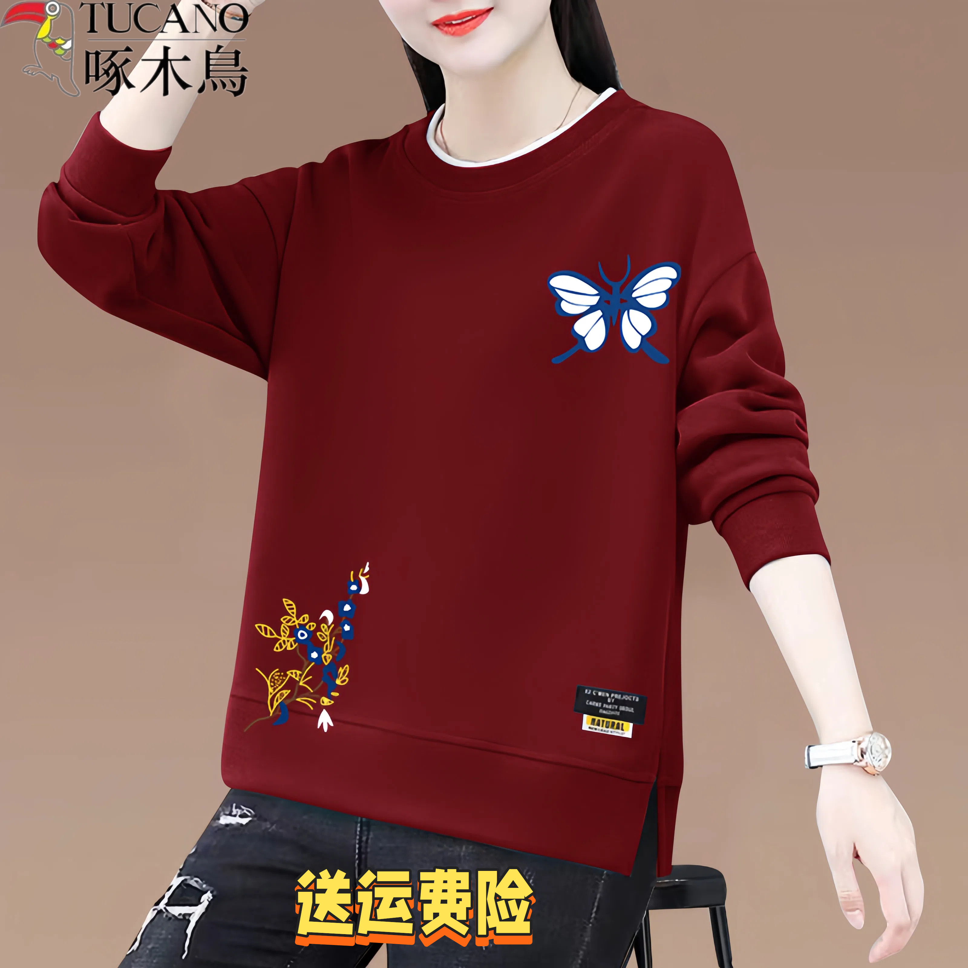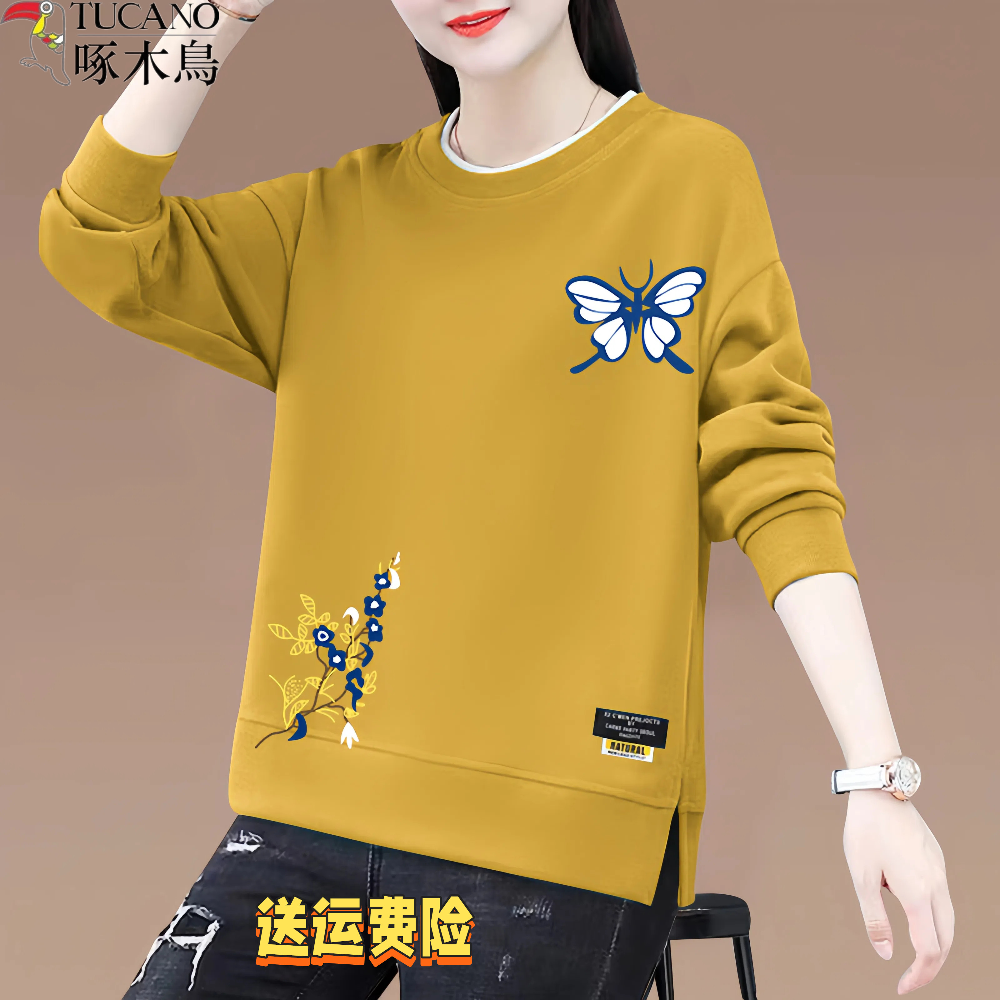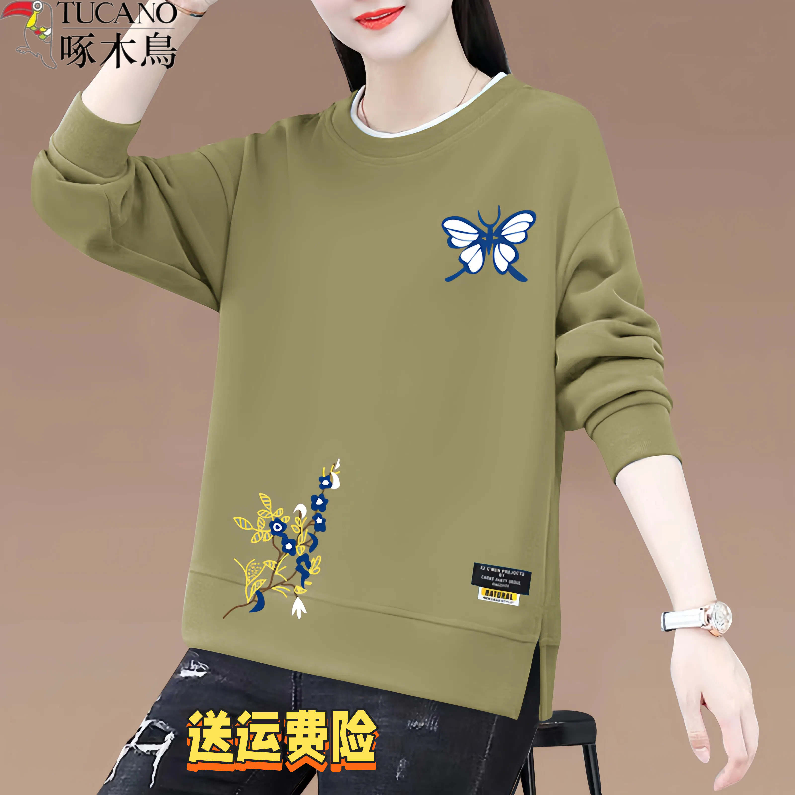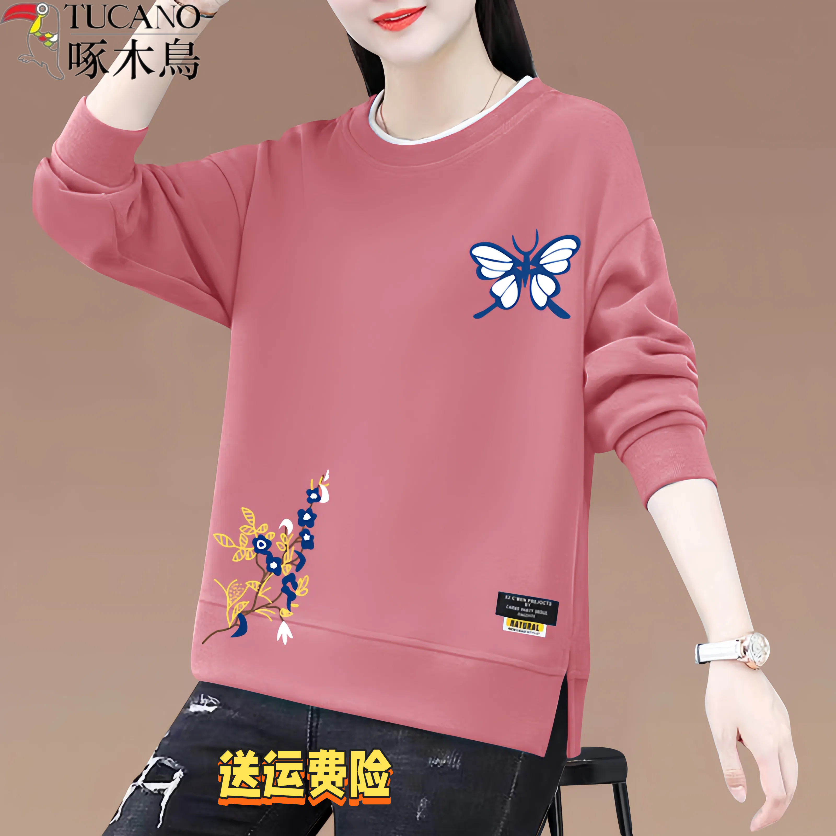 啄木鸟纯棉圆领长袖卫衣女2025秋冬季新款时尚百搭宽松显瘦上衣女