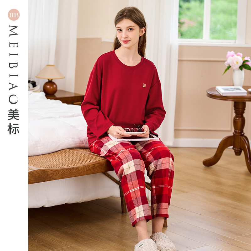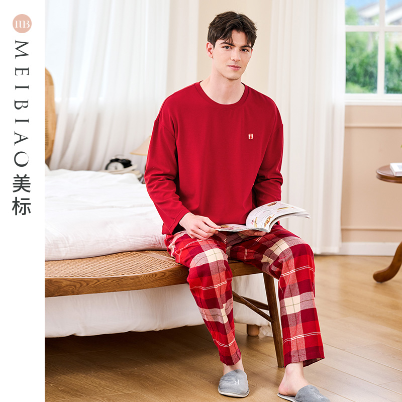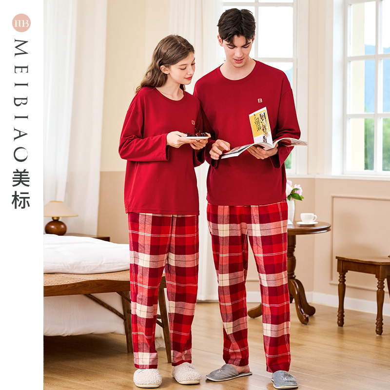 【断码清仓】美标情侣纯棉睡衣套装女男春秋红色本命年全棉家居服
