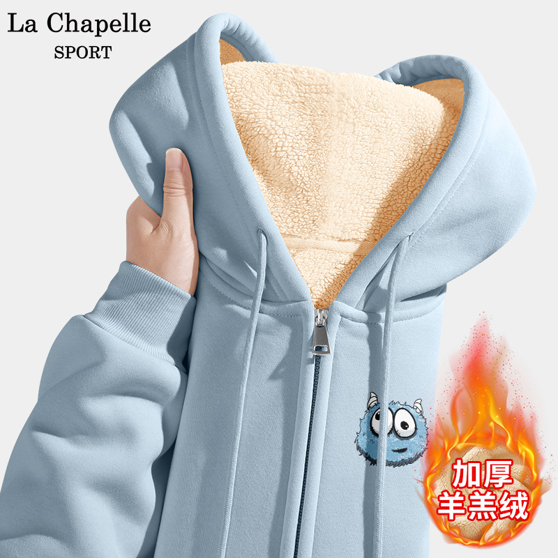 拉夏贝尔连帽卫衣女款加绒加厚上衣2025新款羊羔毛外套女秋冬款X