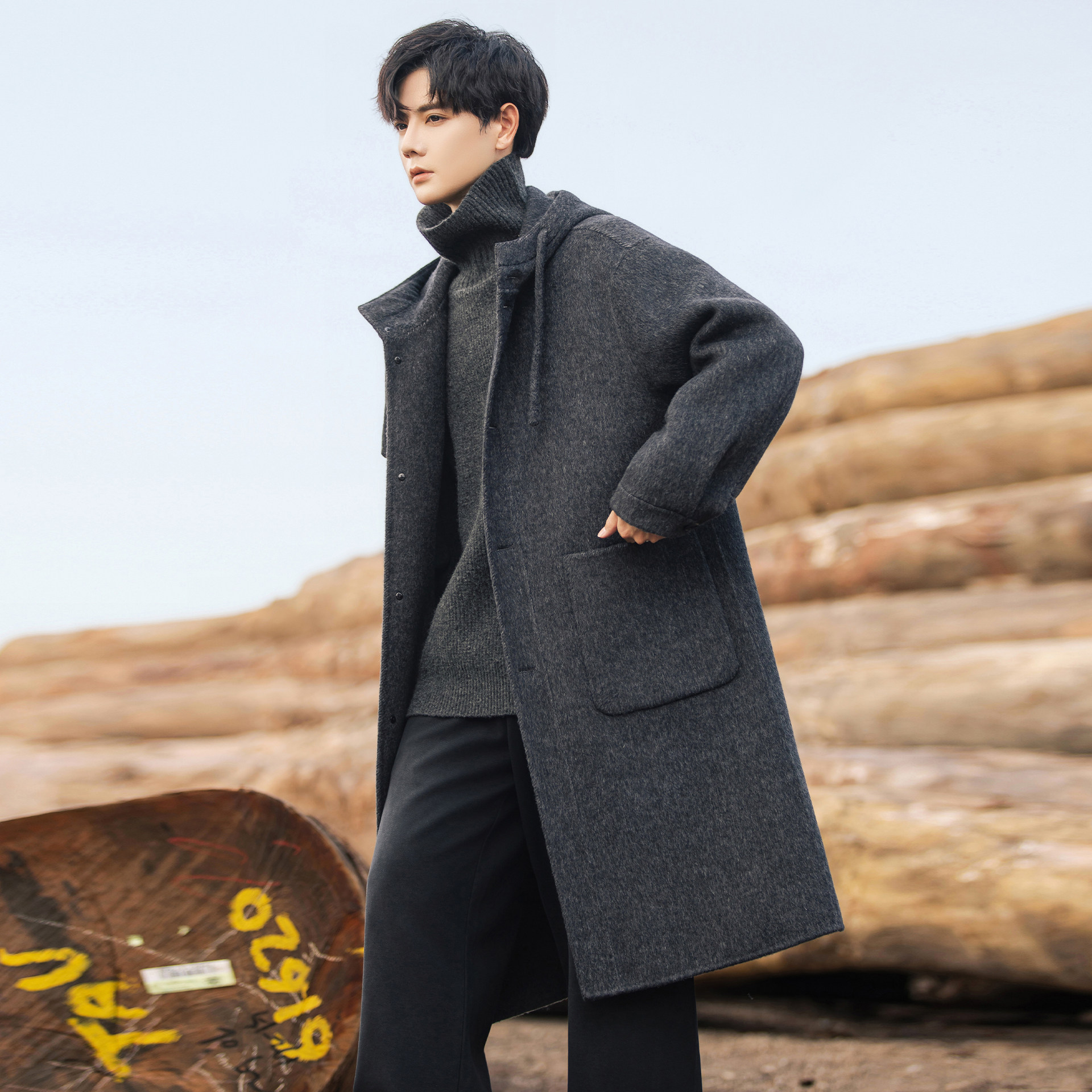 连帽双面呢子大衣男士新款外套潮