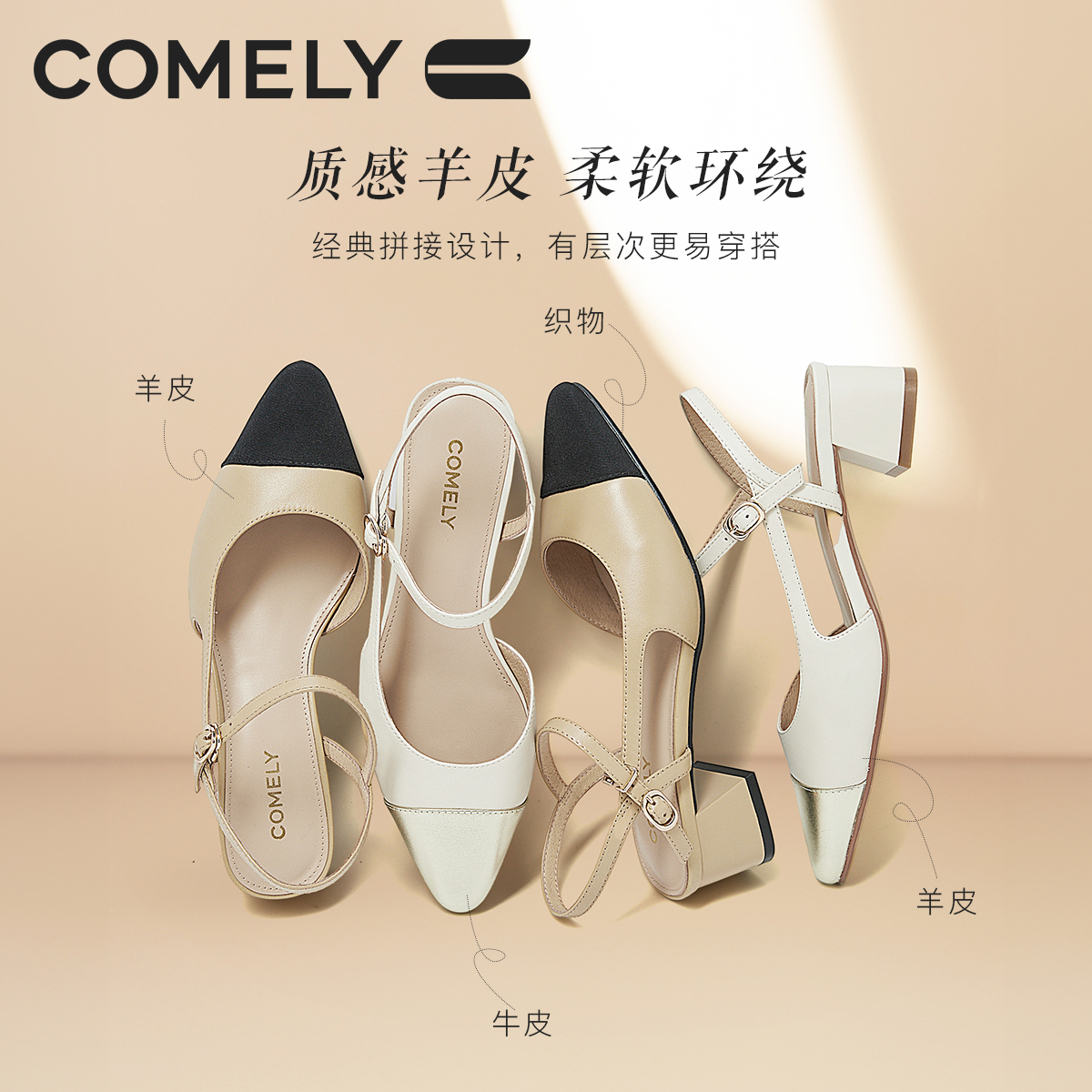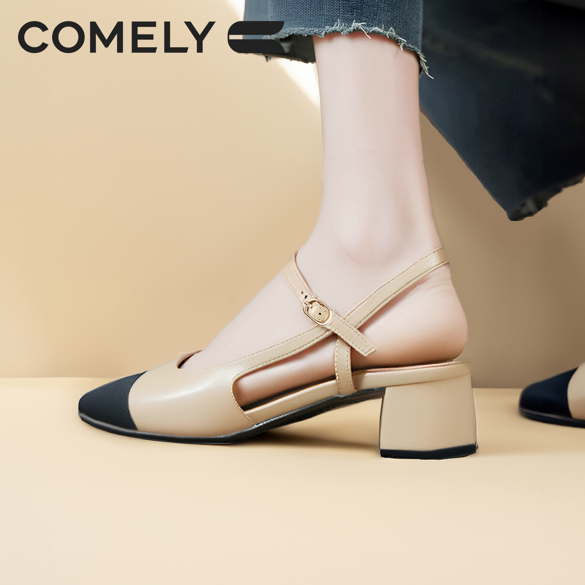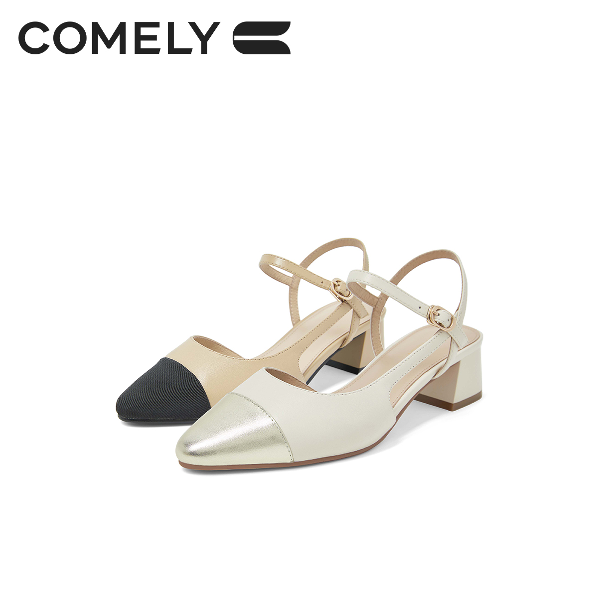 康莉小香风粗跟真皮包头凉鞋