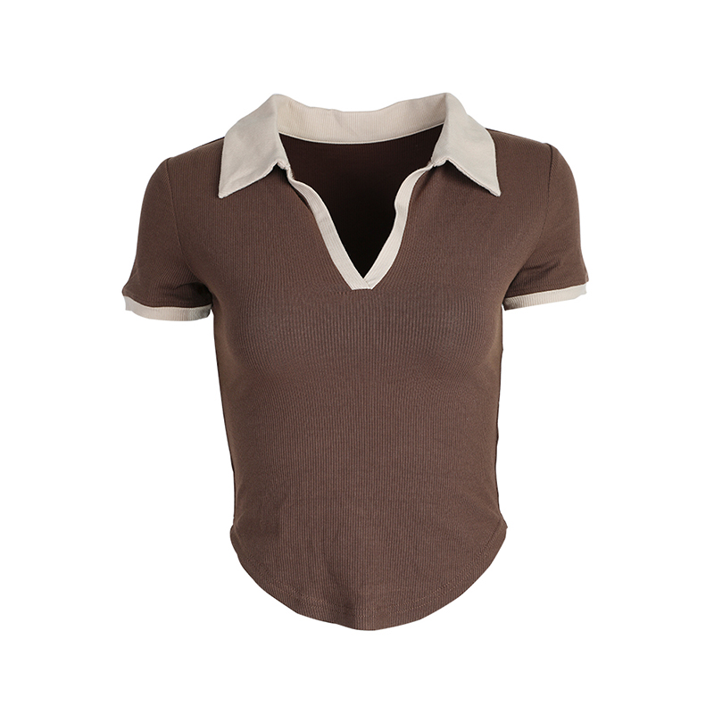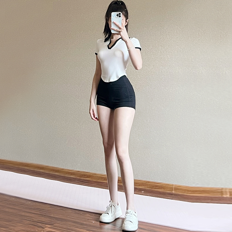 撞色翻领运动短袖女春夏季紧身显瘦瑜伽T恤性感时尚短款健身上衣