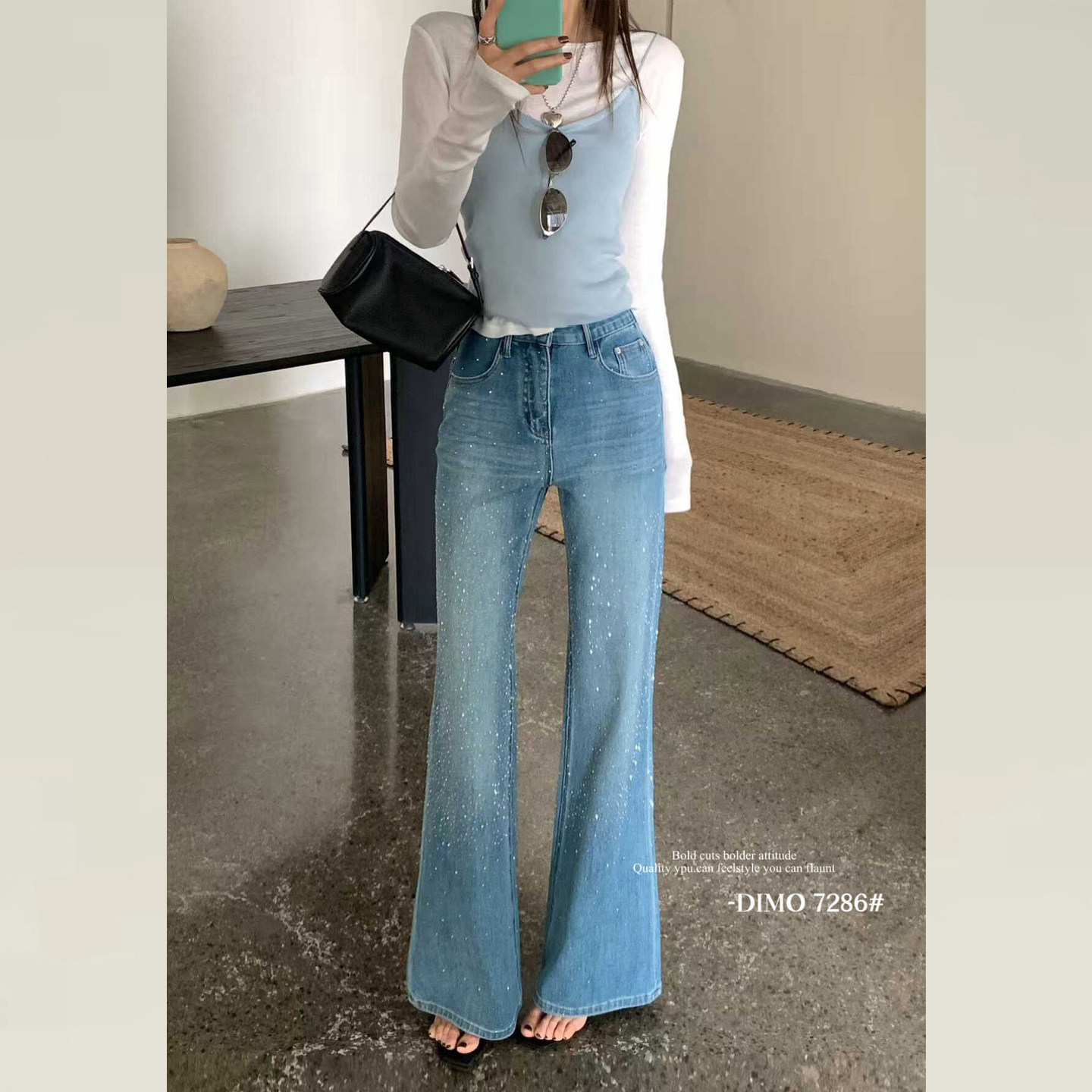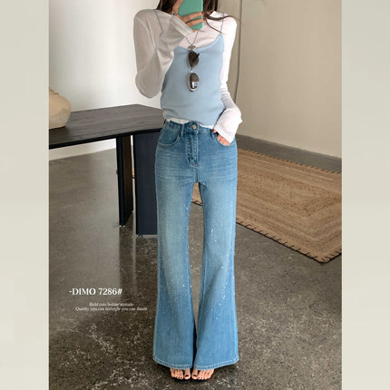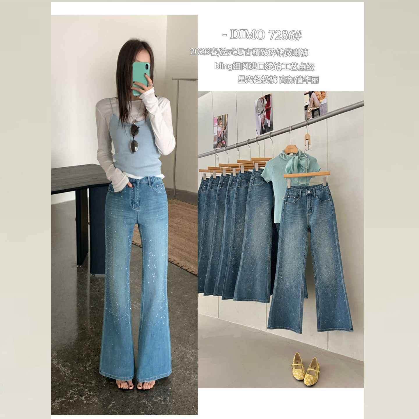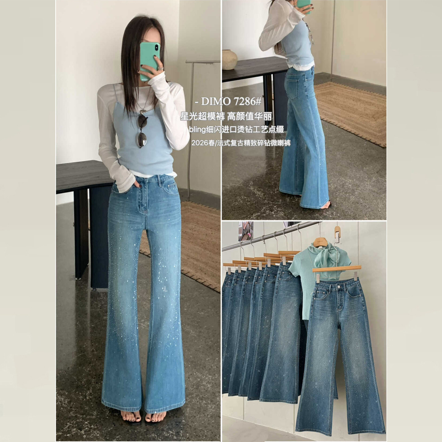 DIMO烫钻满天星牛仔裤女2026早春新款修身显瘦版型超好看的微喇裤