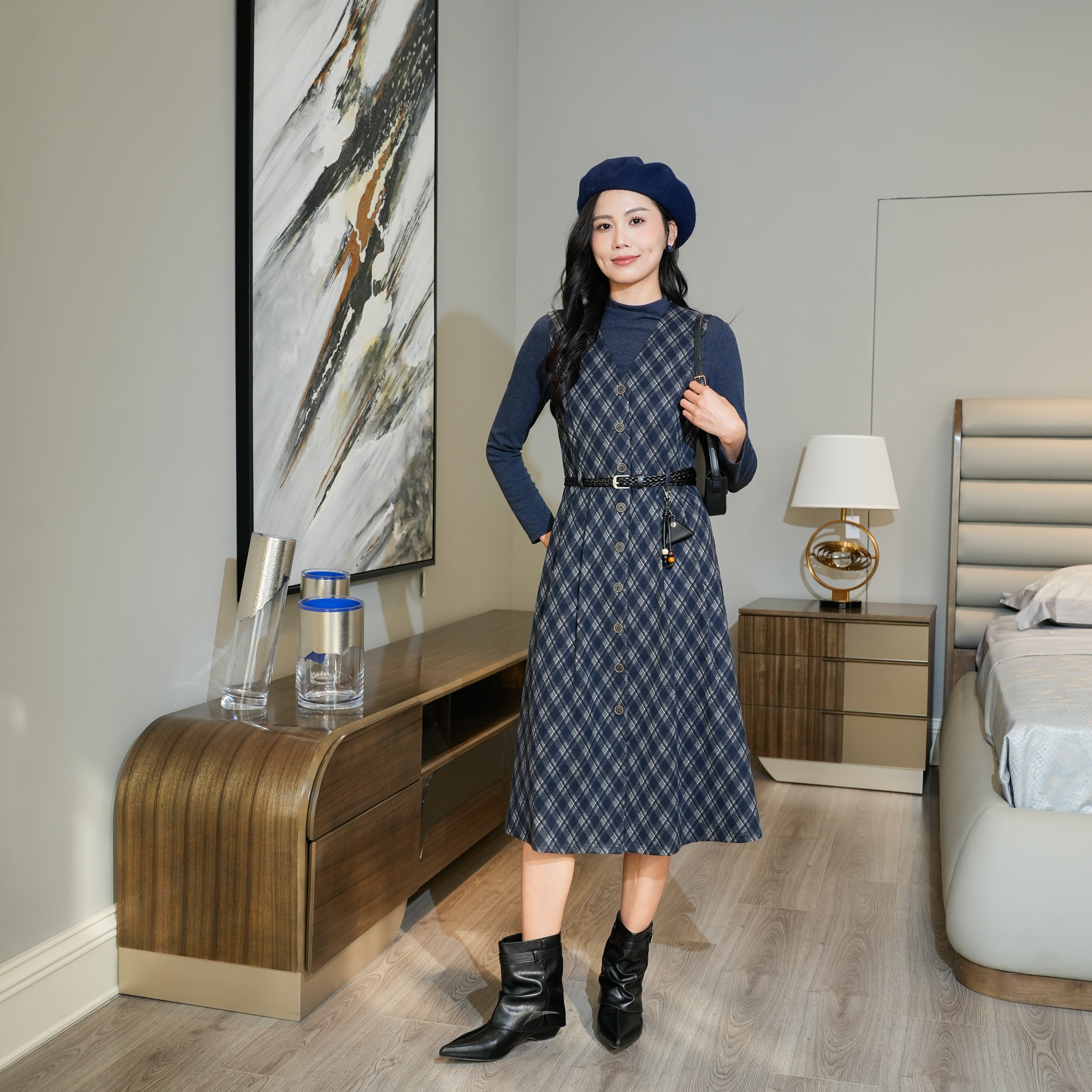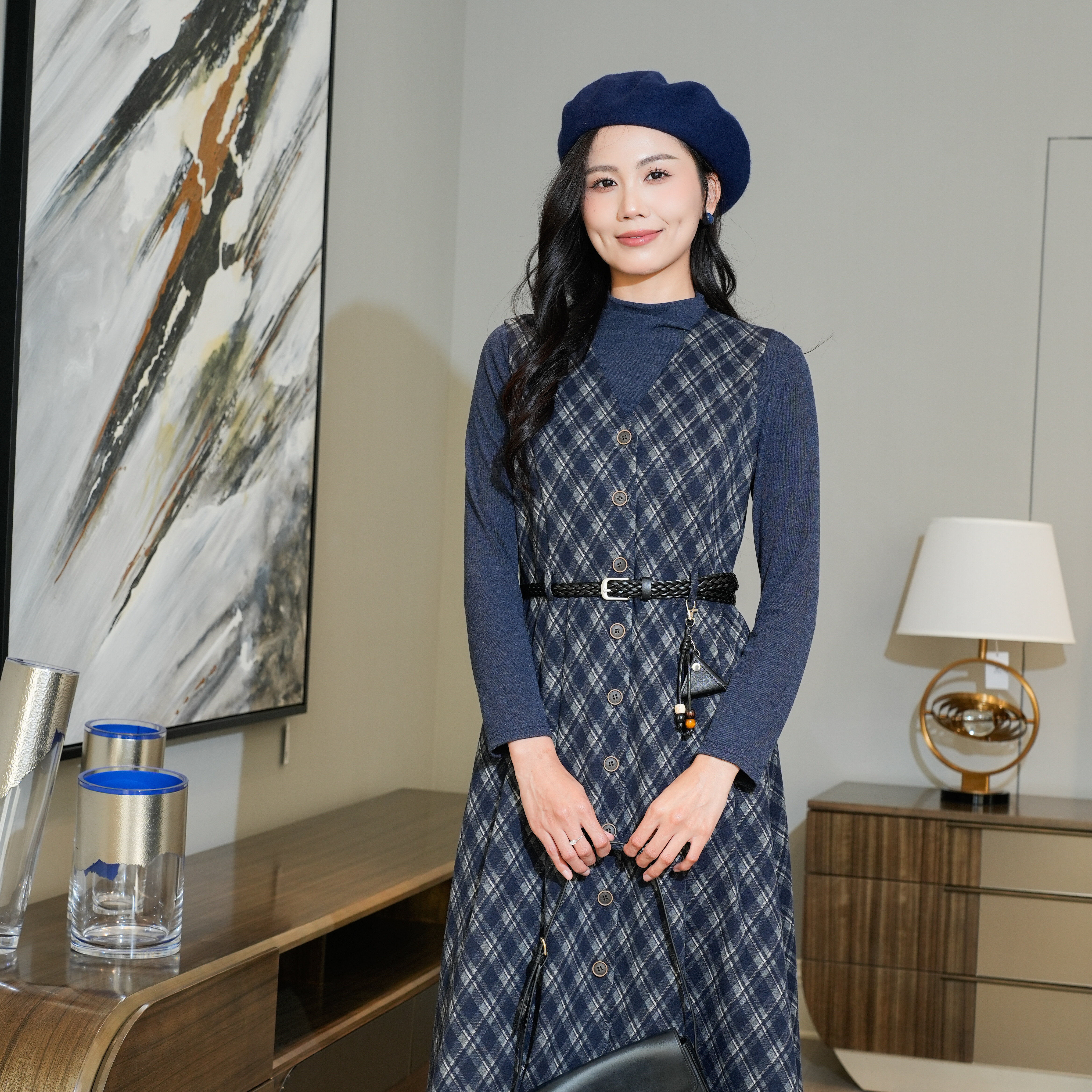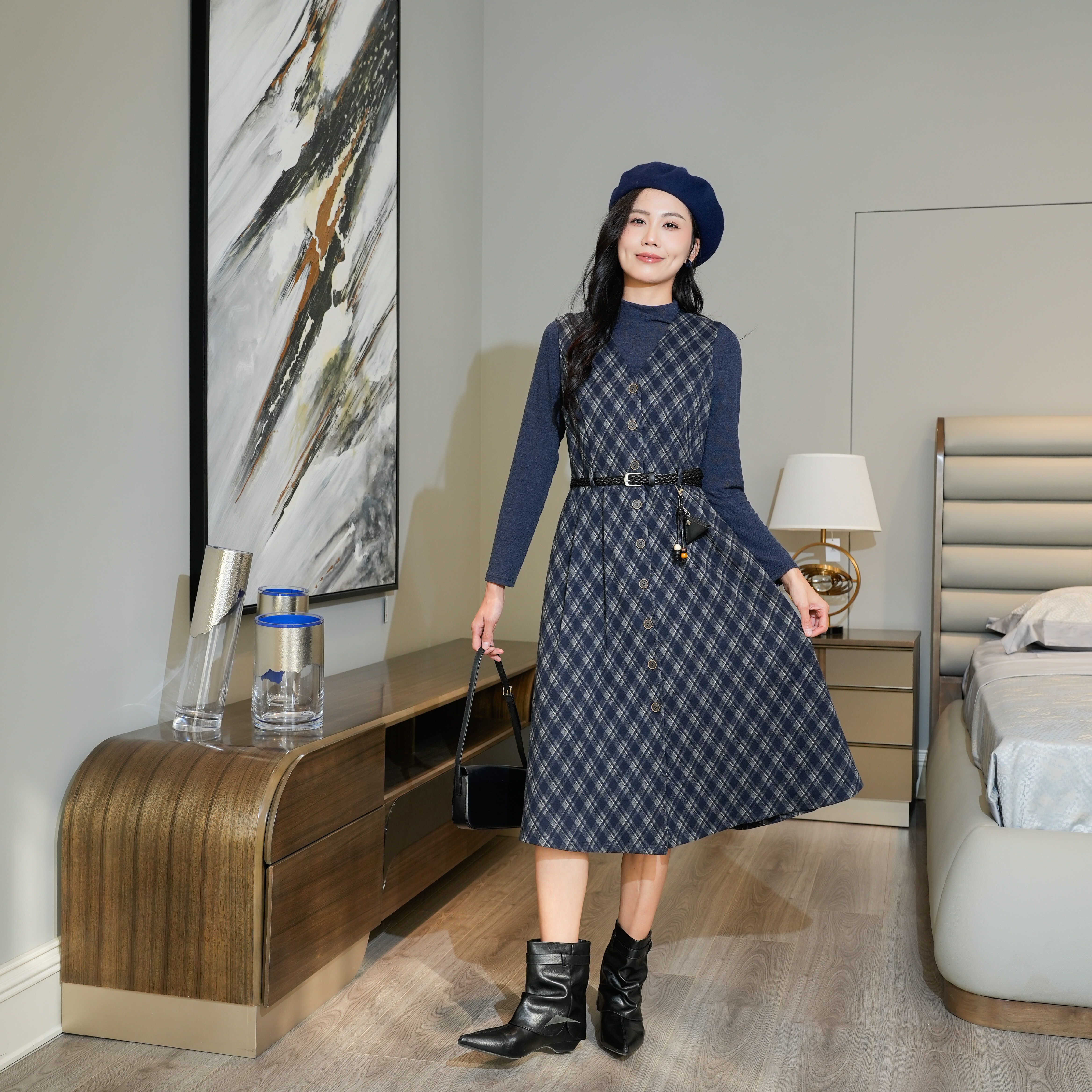 2025秋冬新款收腰绑带连衣裙女时尚格子打底衫背心裙两件套裙