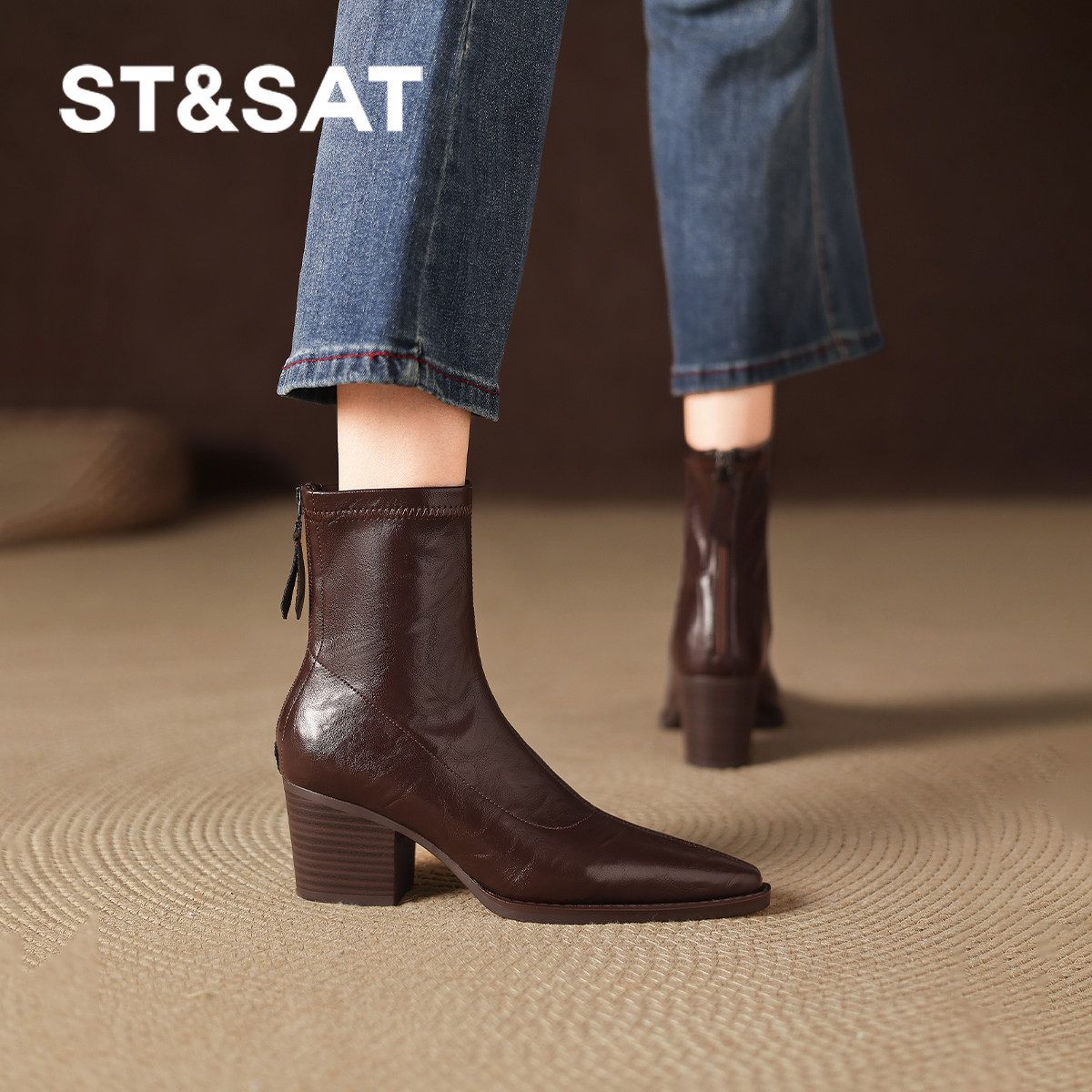 星期六棕色短靴女2026新款秋冬季高跟女靴气质尖头瘦瘦靴复古粗跟