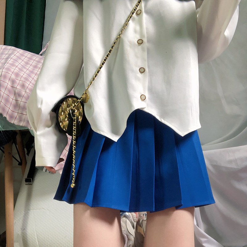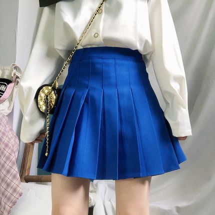 大码短裙胖mm显瘦褶皱高腰西装半身裙宝蓝色a字百褶裙学院风夏季