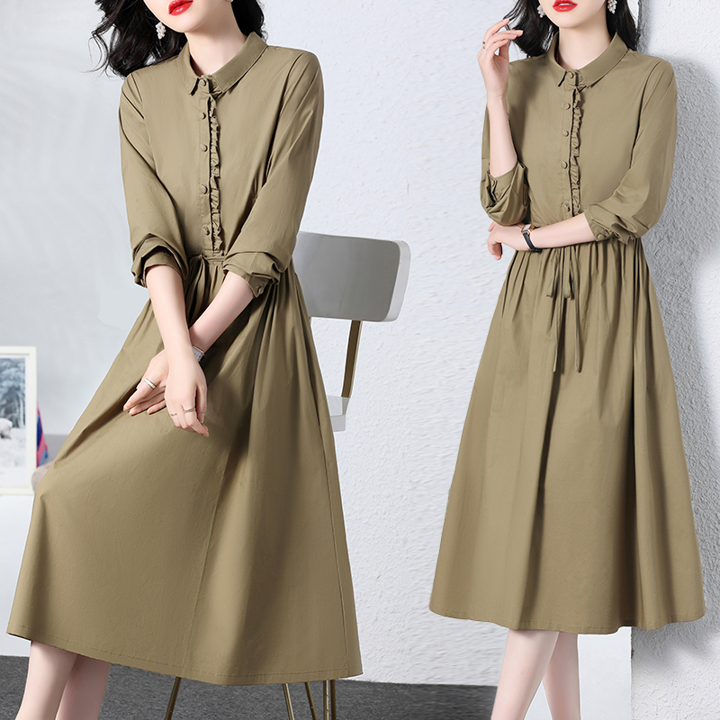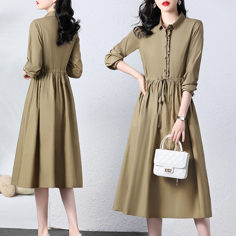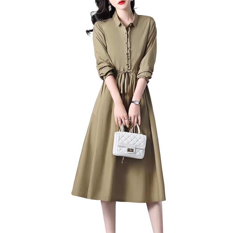 卡其色纯棉长袖连衣裙女2025秋气质收腰显瘦有女人味的衬衫裙子