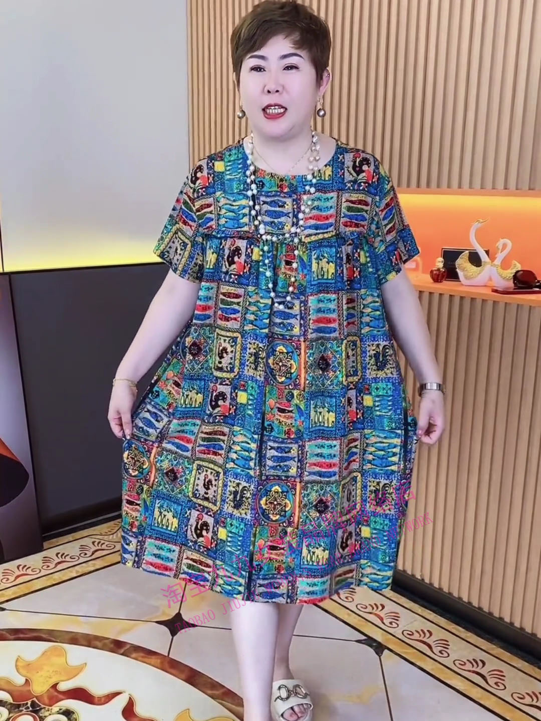 夏大码胖妈妈遮肉连衣裙女士短袖圆领宽松中长款遮肚减龄洋气裙子