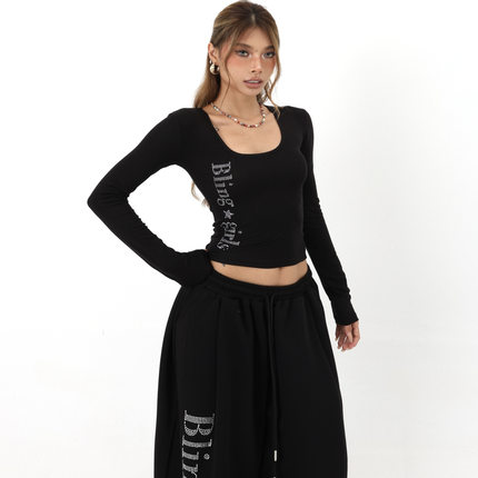 BLINGGIRLS辣妹U领烫钻长袖T恤