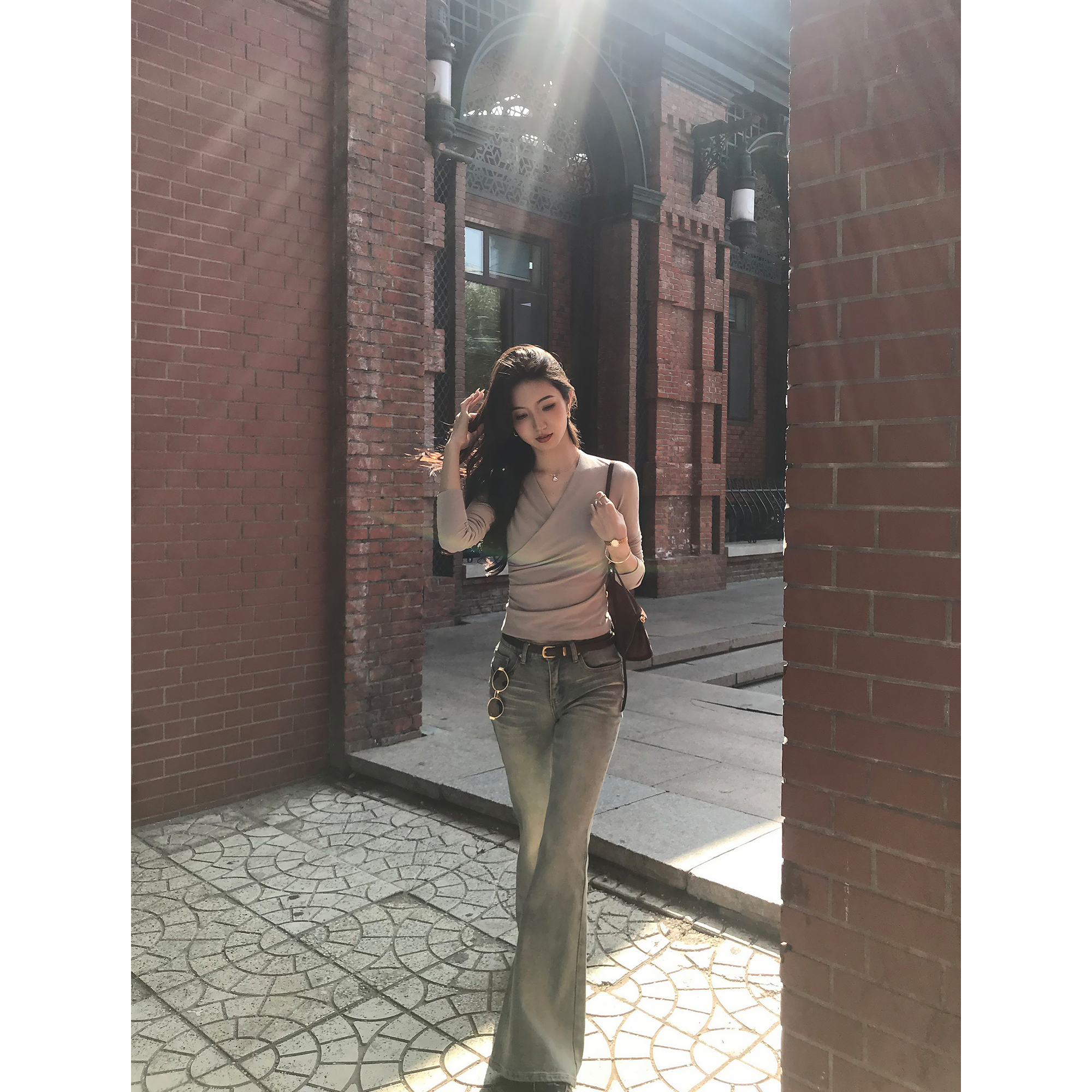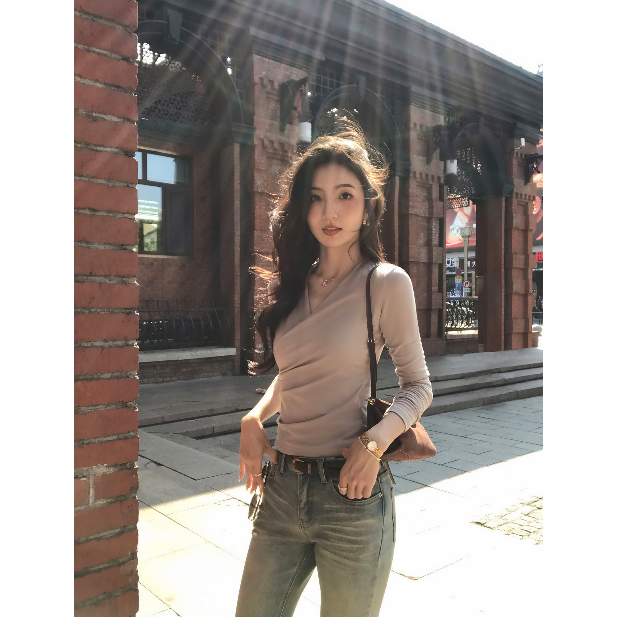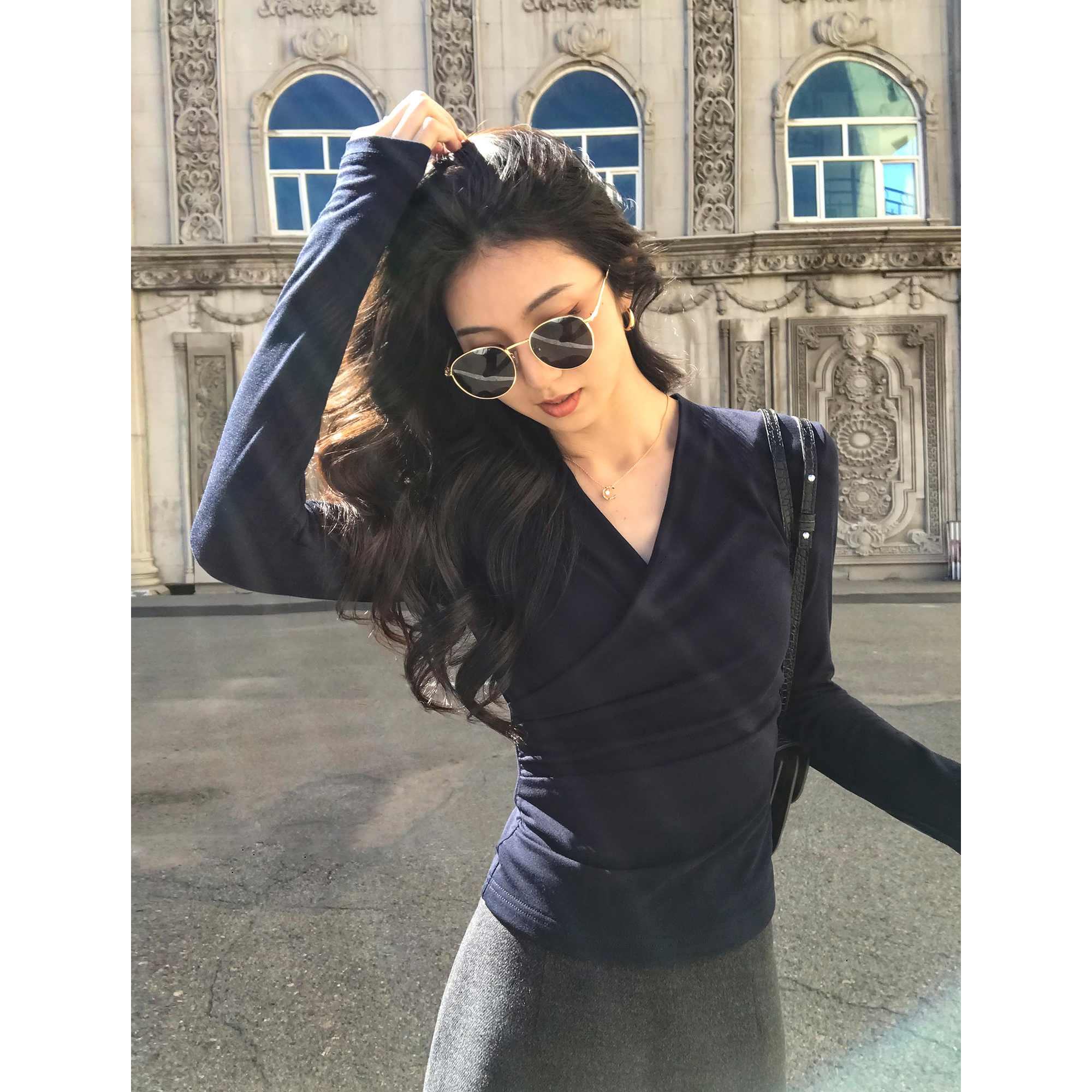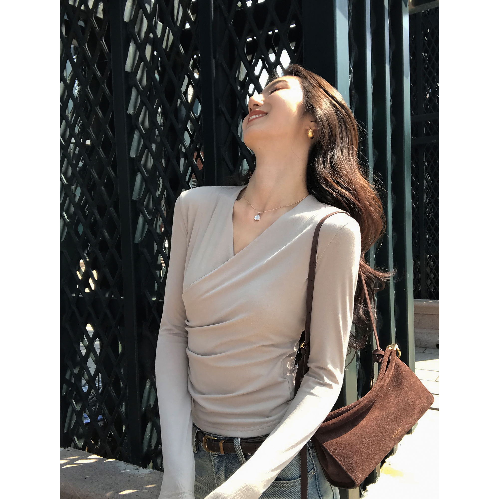 MULVAN 气质拉满 交叉v领长袖t恤女内搭打底衫修身收腰针织上衣