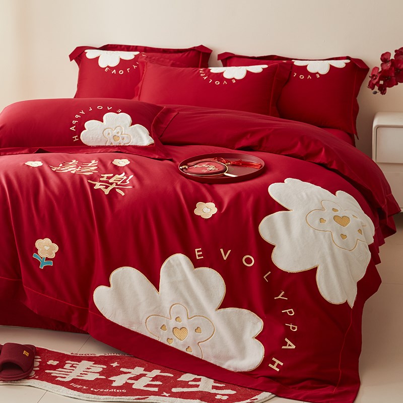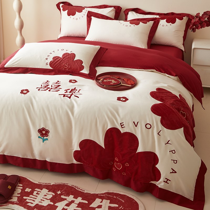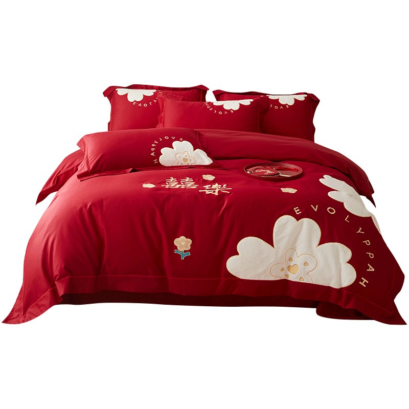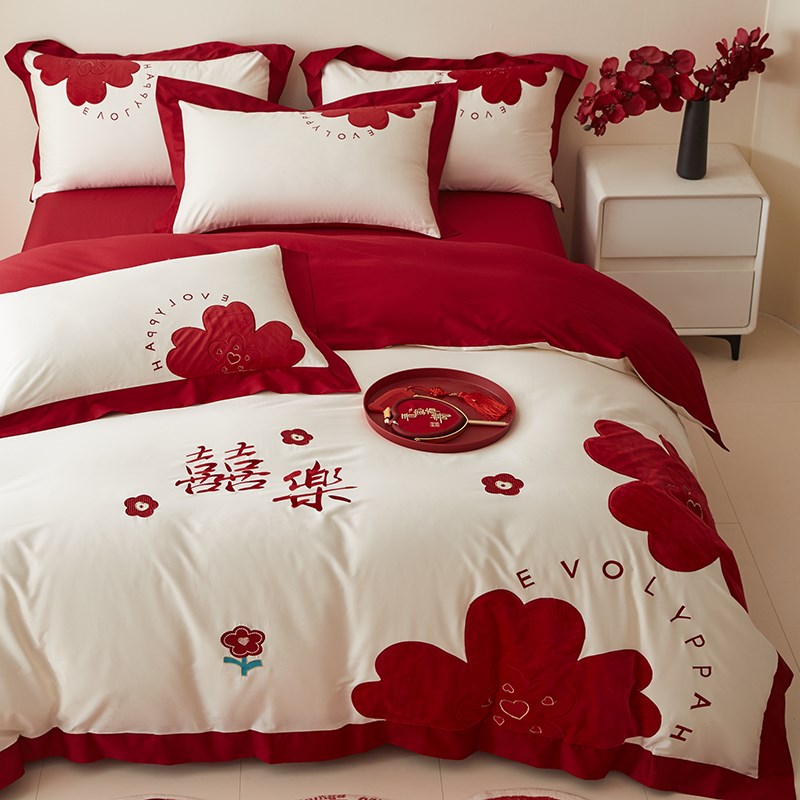 刺绣结婚床上用品四件套s婚庆婚房喜被高级感床单被套红色婚礼被