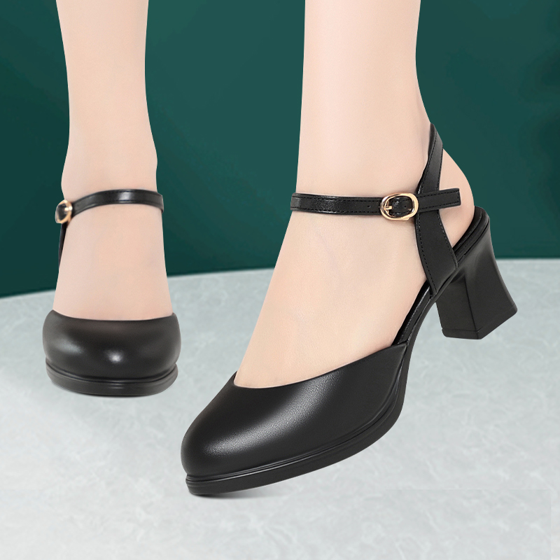 2025年新款粗跟耐磨防滑透气女鞋夏季黑色百搭高跟鞋一字扣带凉鞋