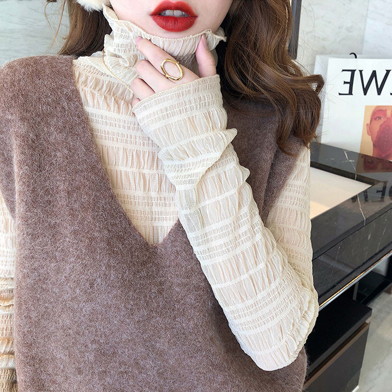大码胖MM高领蕾丝打底衫女网纱内搭春秋2025新款叠穿小衫长袖上衣