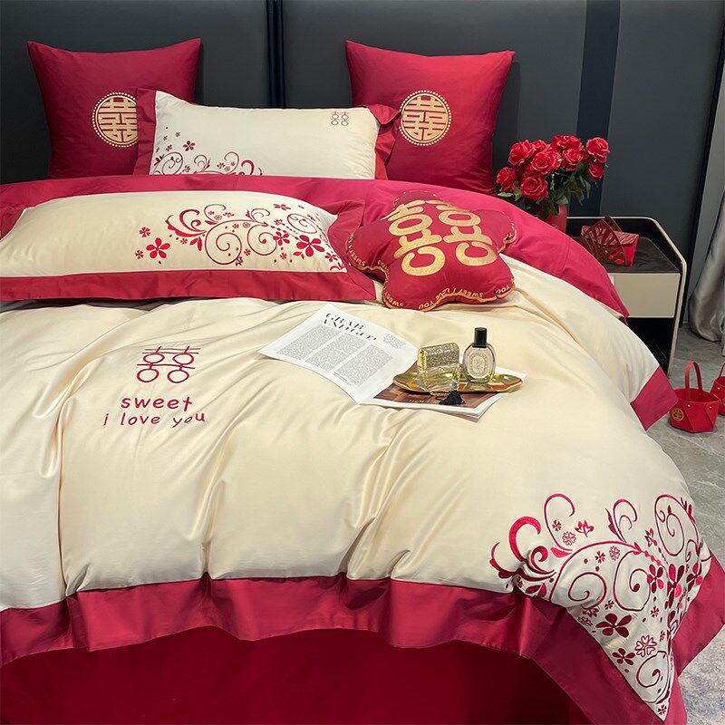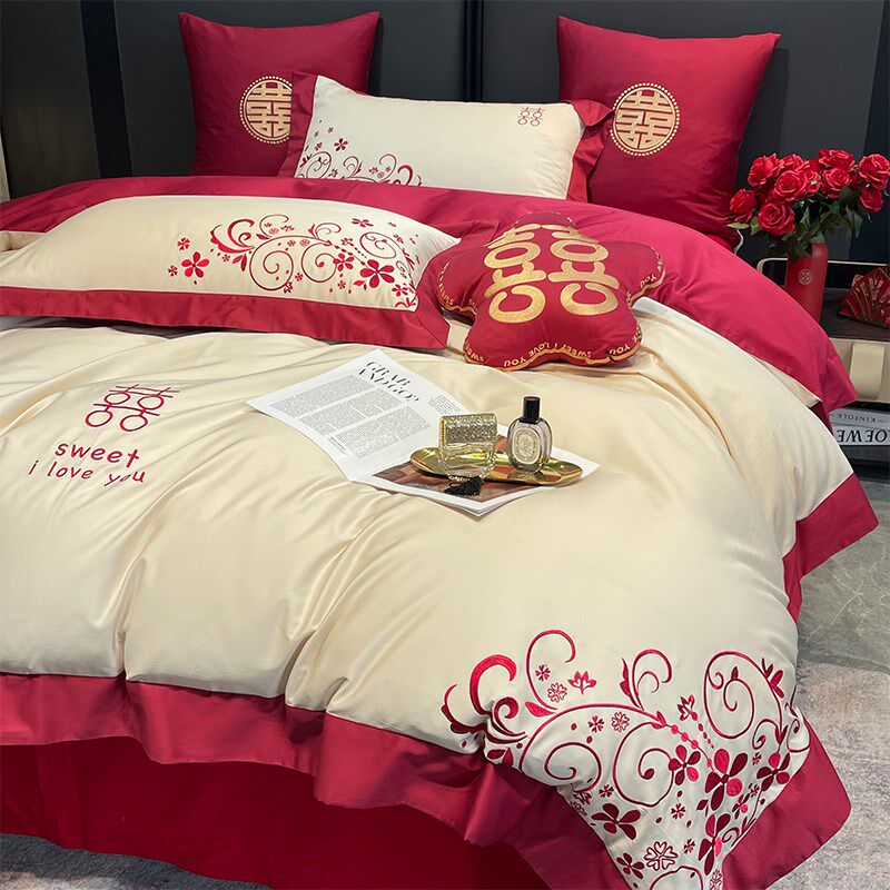 高级感160支长绒棉结婚四件套红色婚庆被套床单喜被床上用品4