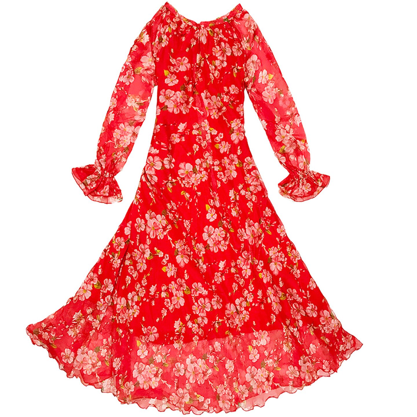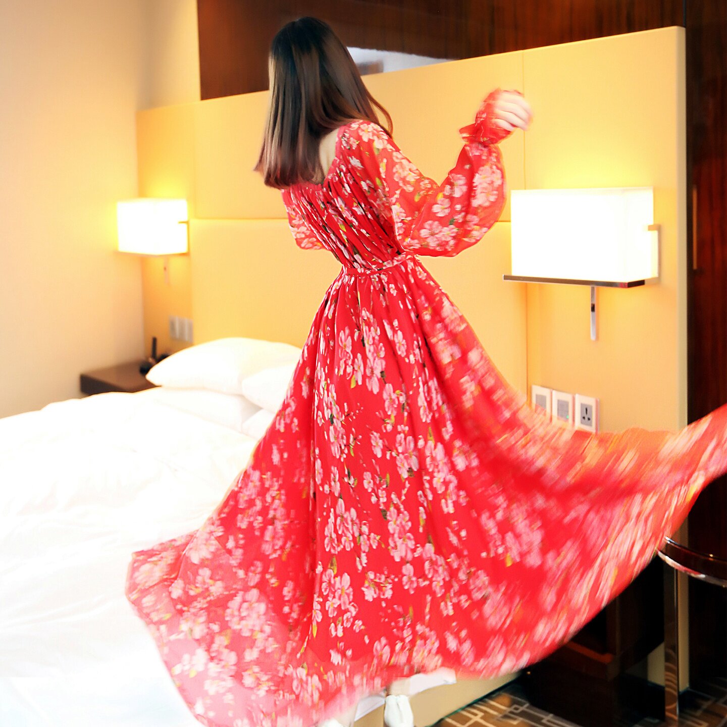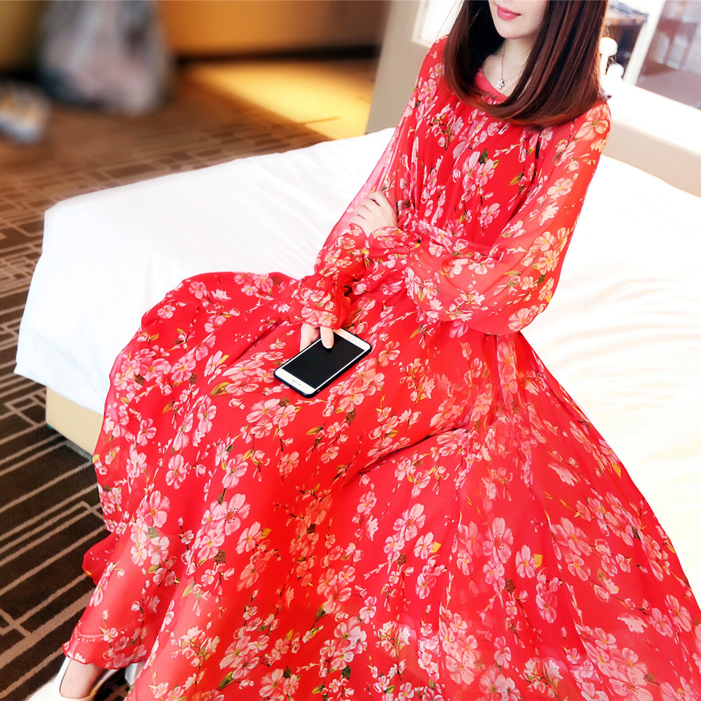 春季新款连衣裙女长袖碎花大码雪纺宽松显瘦大摆长裙仙女度假裙子