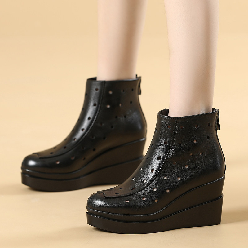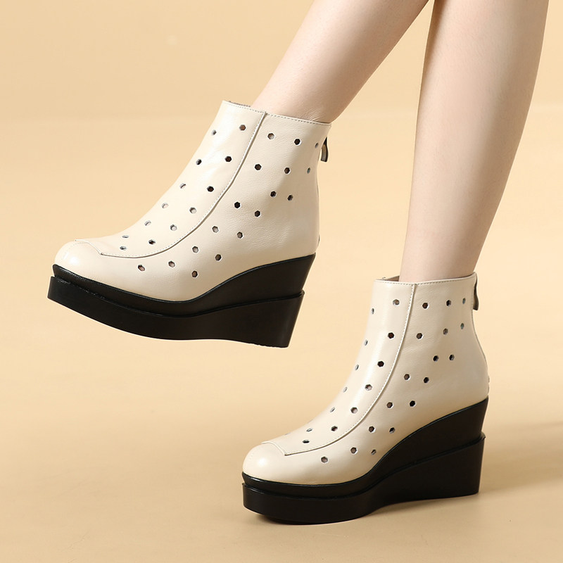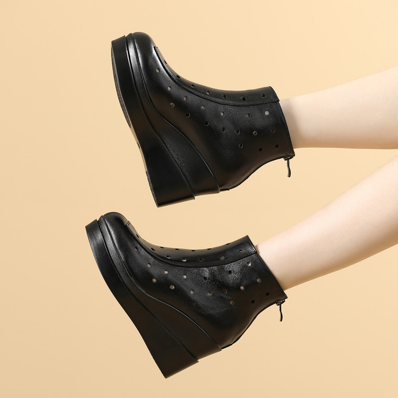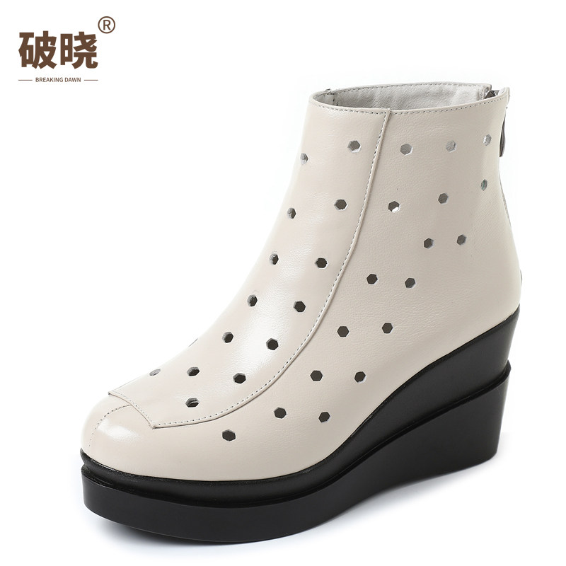 春夏季真皮坡跟镂空女靴短筒靴子百搭洞洞凉靴透气松糕女鞋小码33
