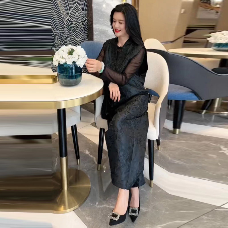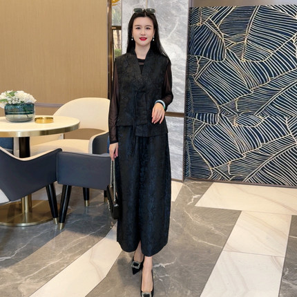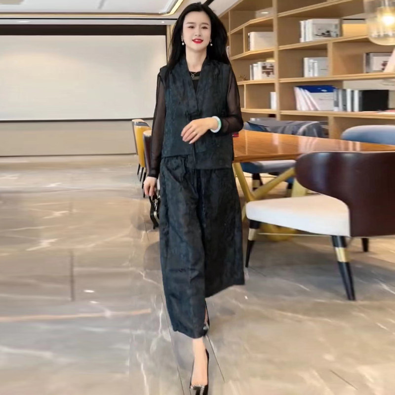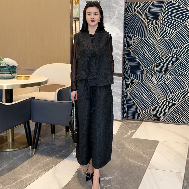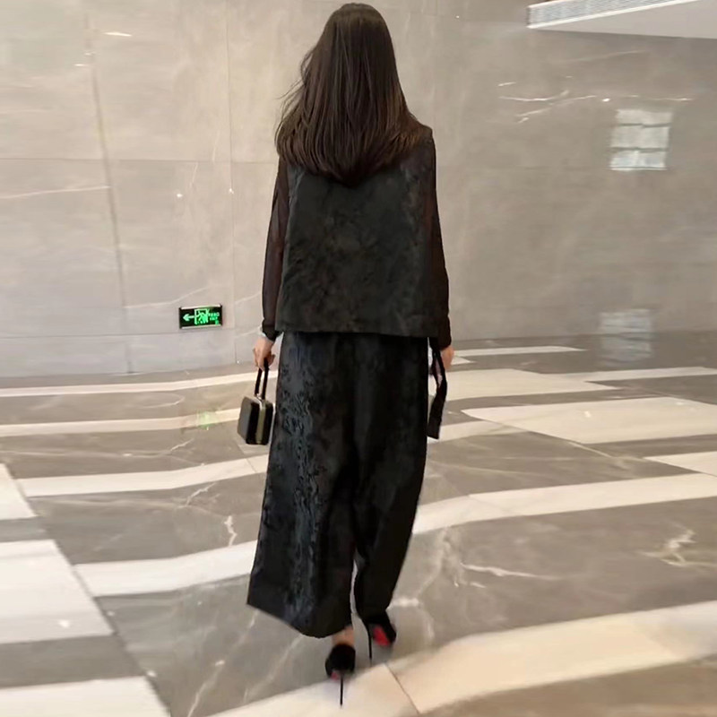 欧货春夏新款洋气真丝提花国风马甲+高腰阔腿裤宽松大码两件套装