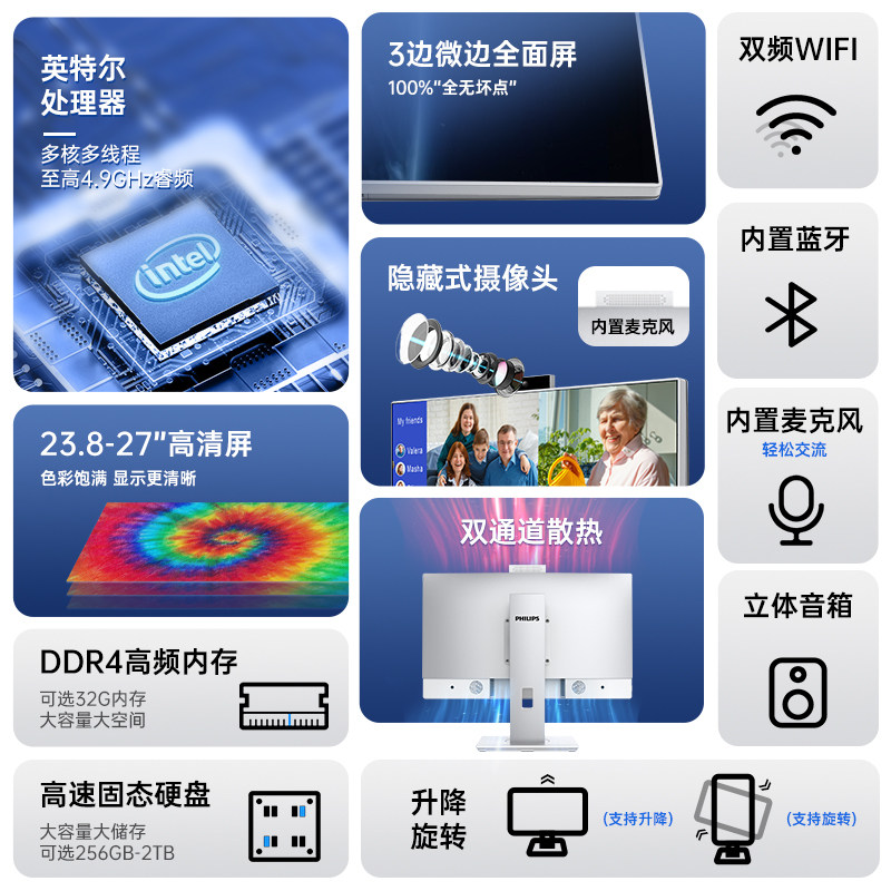 飞利浦品牌电脑一体机23.8/27英寸台式家用酷睿i3i5i7升降旋转带摄像头麦克风办公学习网课游戏直播台式主机