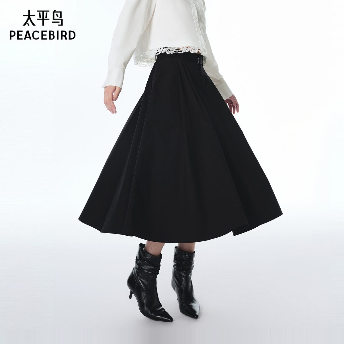 【商场同款】太平鸟黑色伞裙半身裙长绒棉仿天丝工艺A3GFF3276