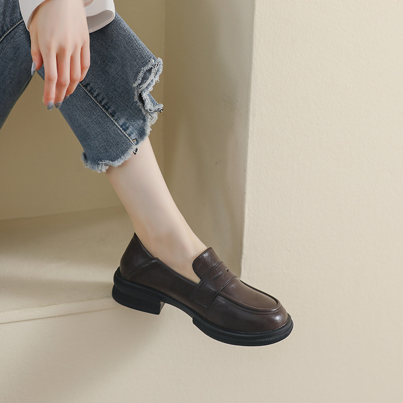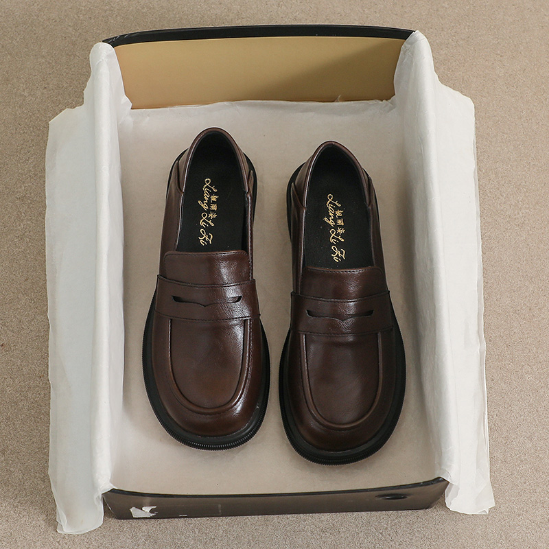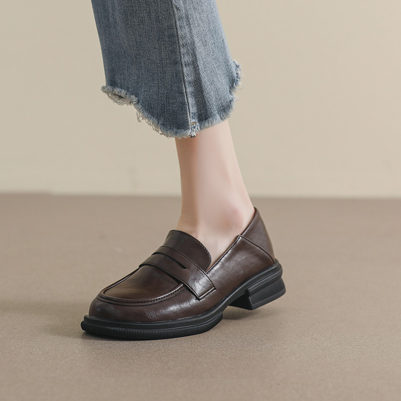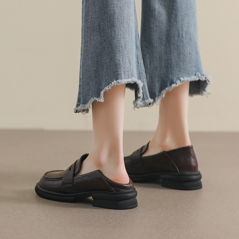 棕色英伦小皮鞋女2025春秋新款百搭真皮平底一脚蹬乐福鞋工作单鞋