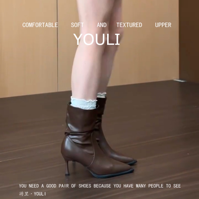 羊皮版~复古法式气质短靴女细跟尖头褶皱堆堆靴弹力瘦瘦靴