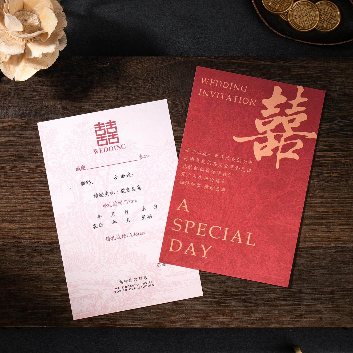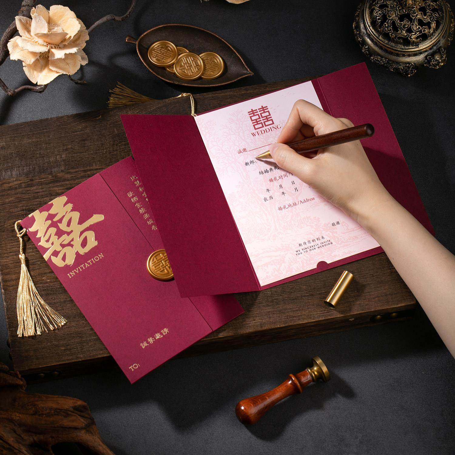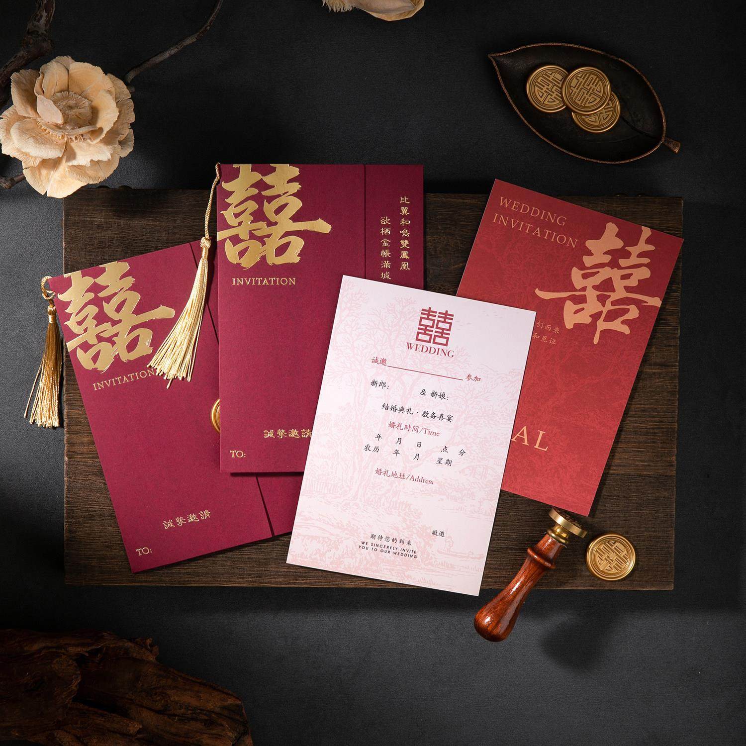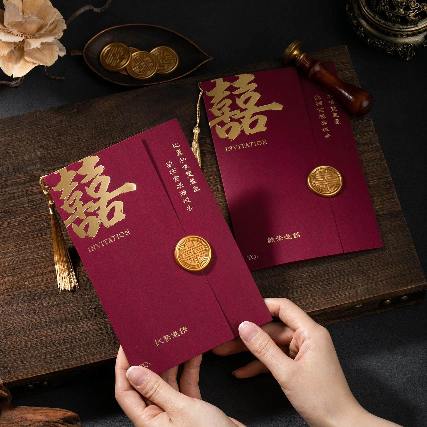 结婚请帖定制打印2025婚礼邀请函答谢宴喜帖酒红流苏中国风请柬