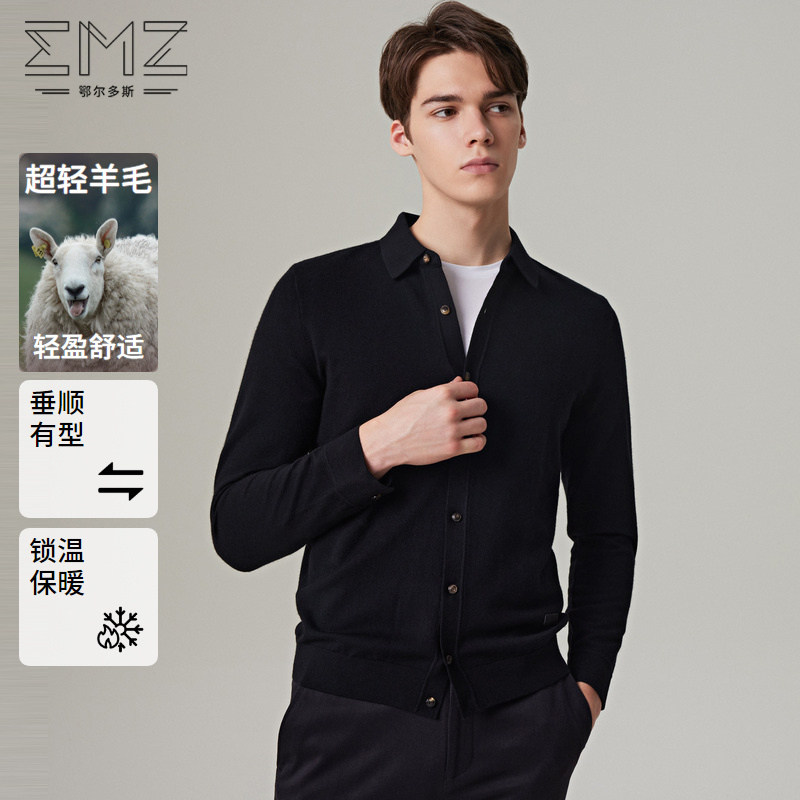 【超轻羊毛】emz鄂尔多斯秋冬老钱风简约翻领纽扣针织开衫外套男