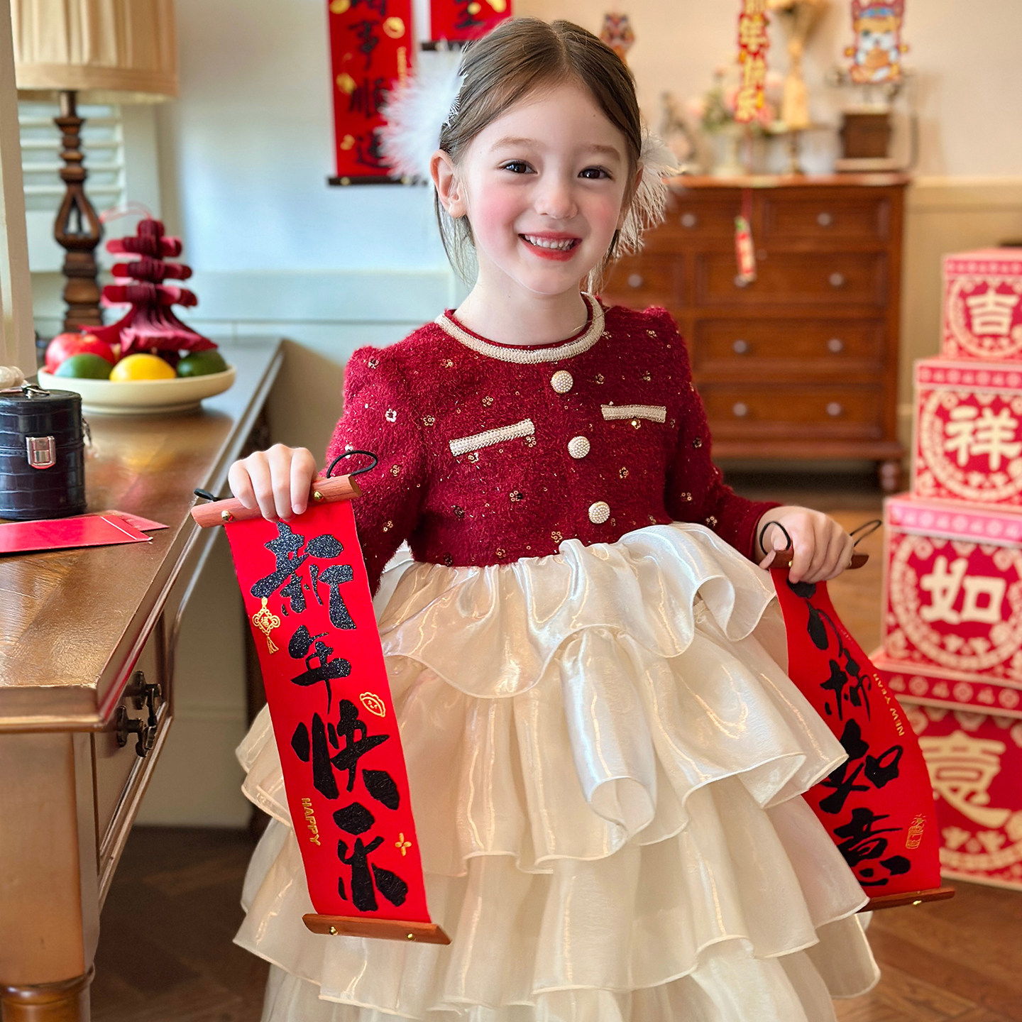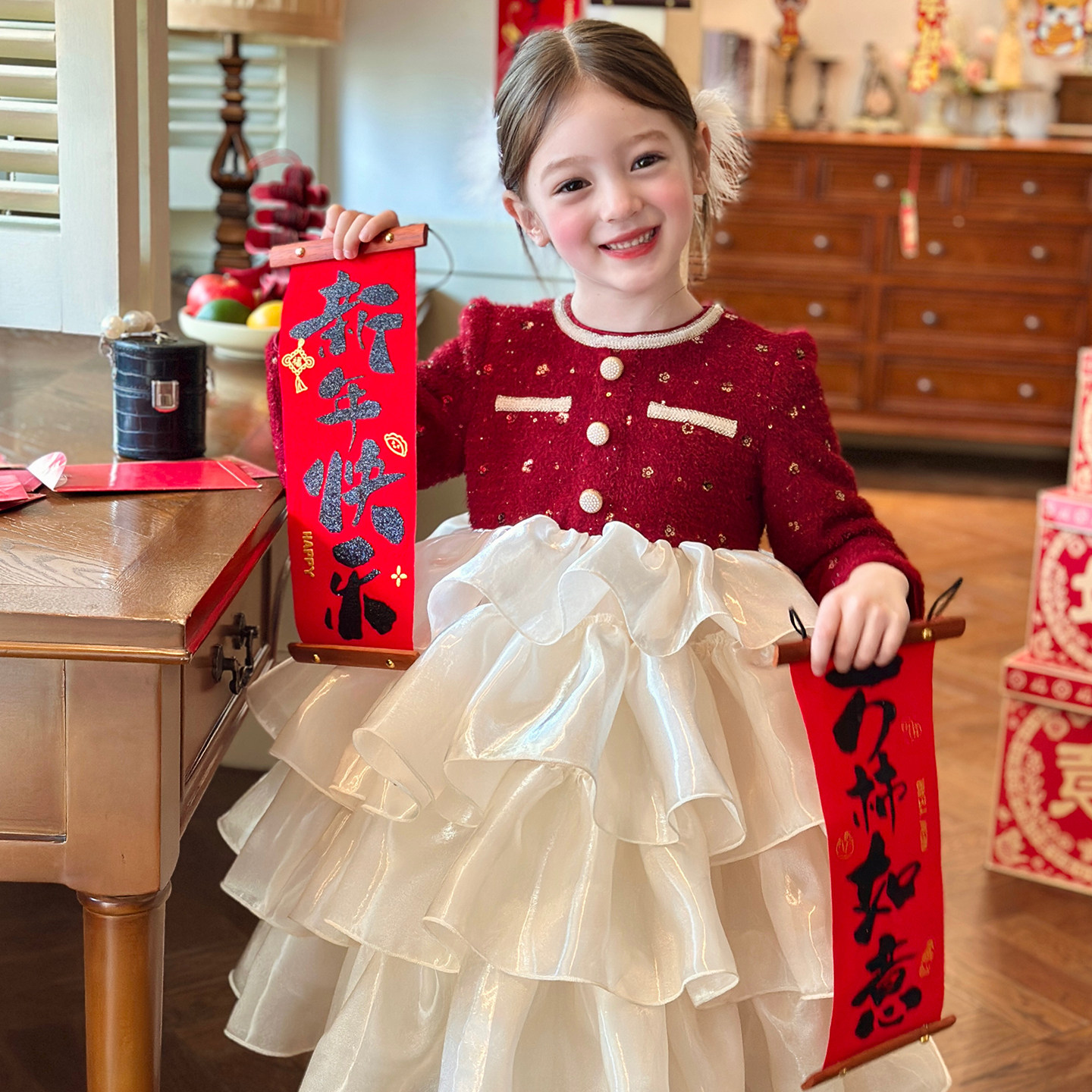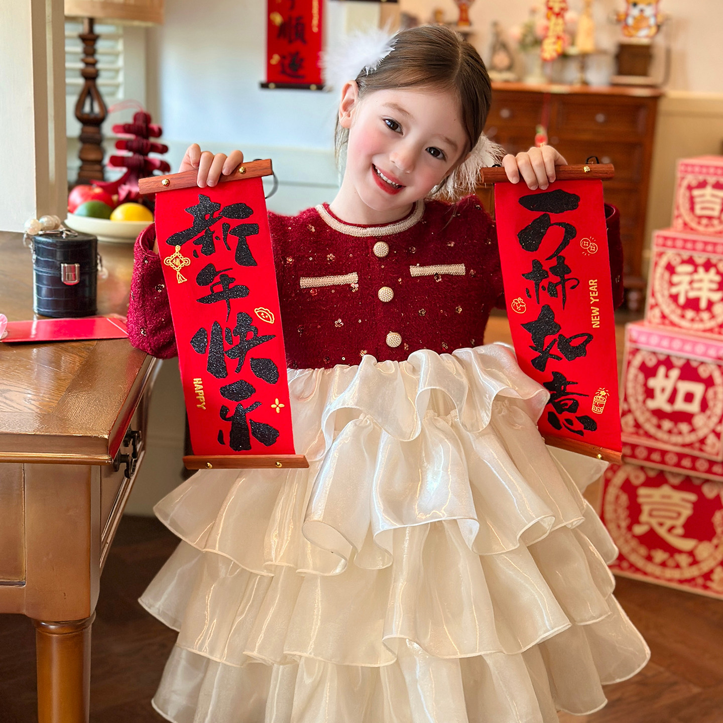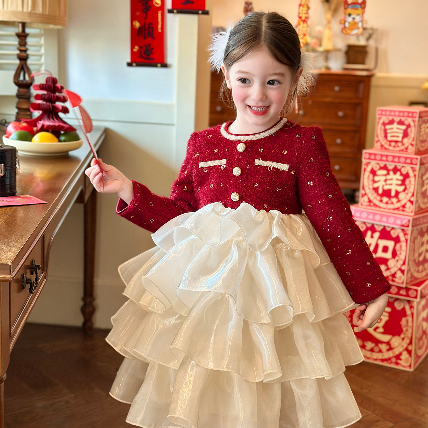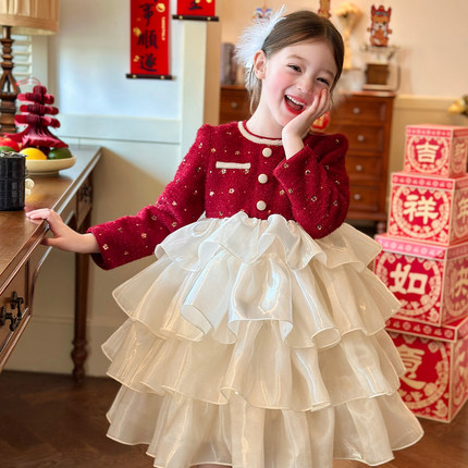 栀了成长记童装女童新年小香风连衣裙2025冬季儿童红色加绒公主裙
