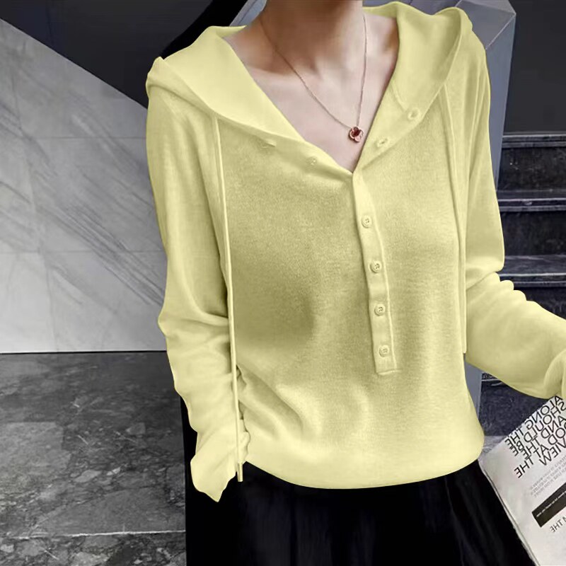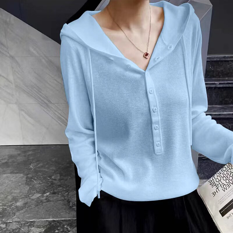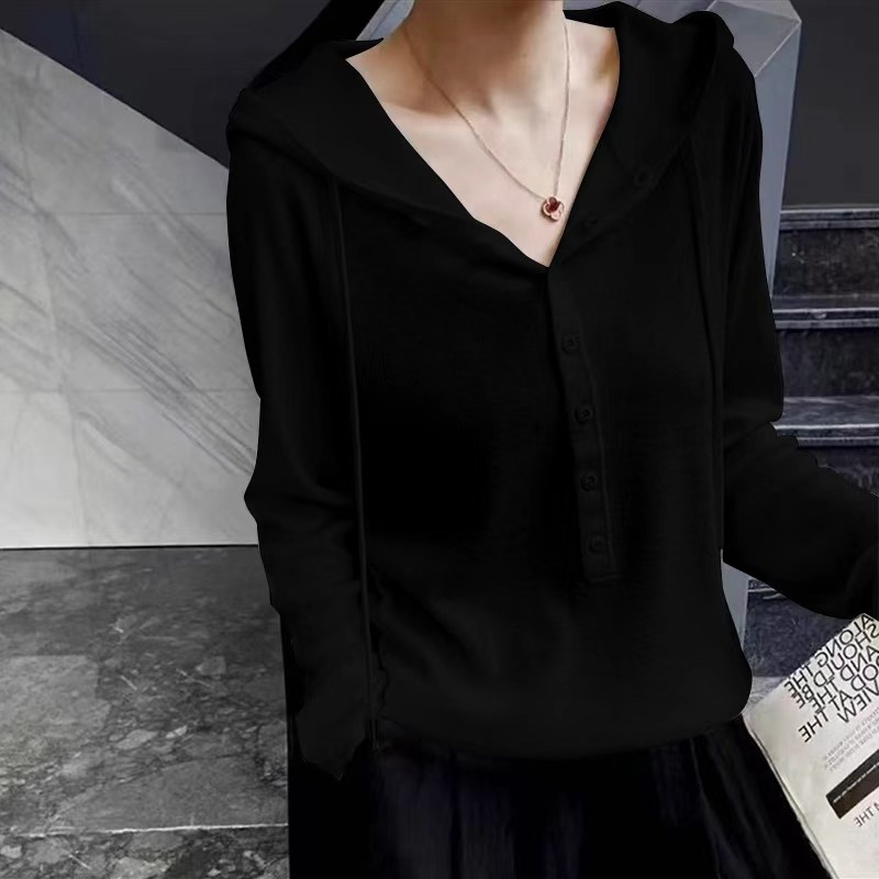纯棉连帽长袖t恤女士春秋新款宽松显瘦纽扣高级感薄款卫衣打底衫