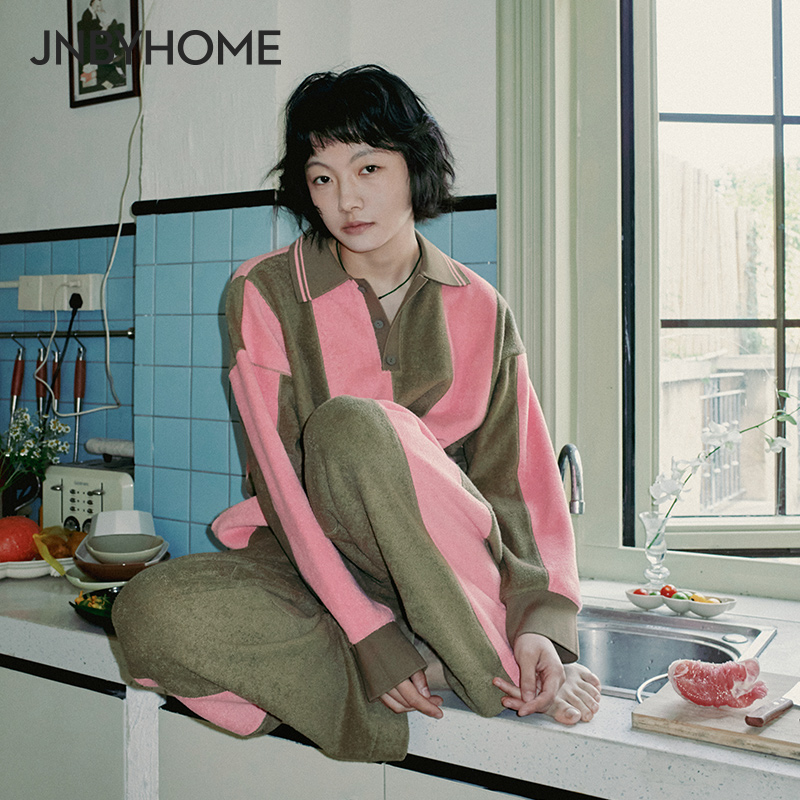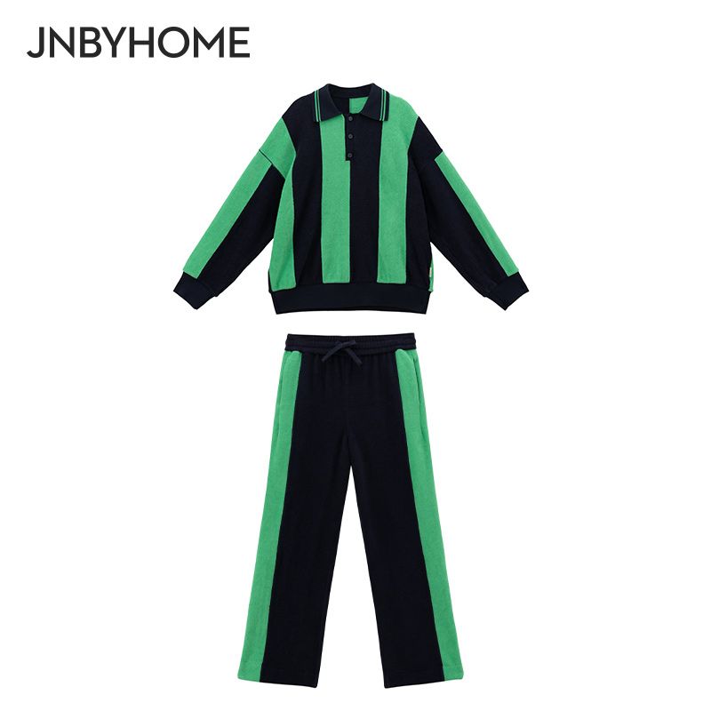 JNBYHOME江南布衣冬舒适撞色条纹睡衣男女情侣套装毛巾料家居服