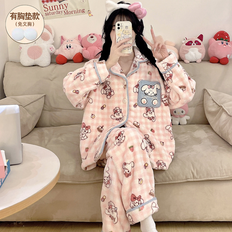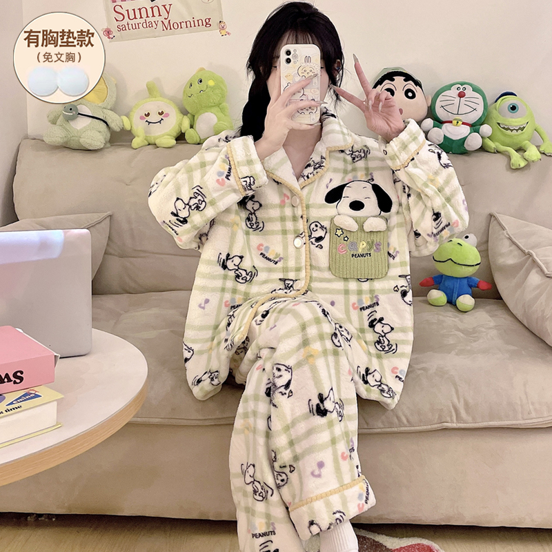 冬季睡衣女款保暖加绒加厚珊瑚绒法兰绒家居服2025新款带胸垫套装