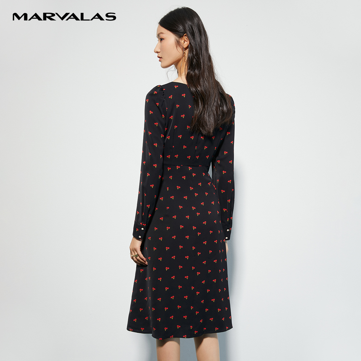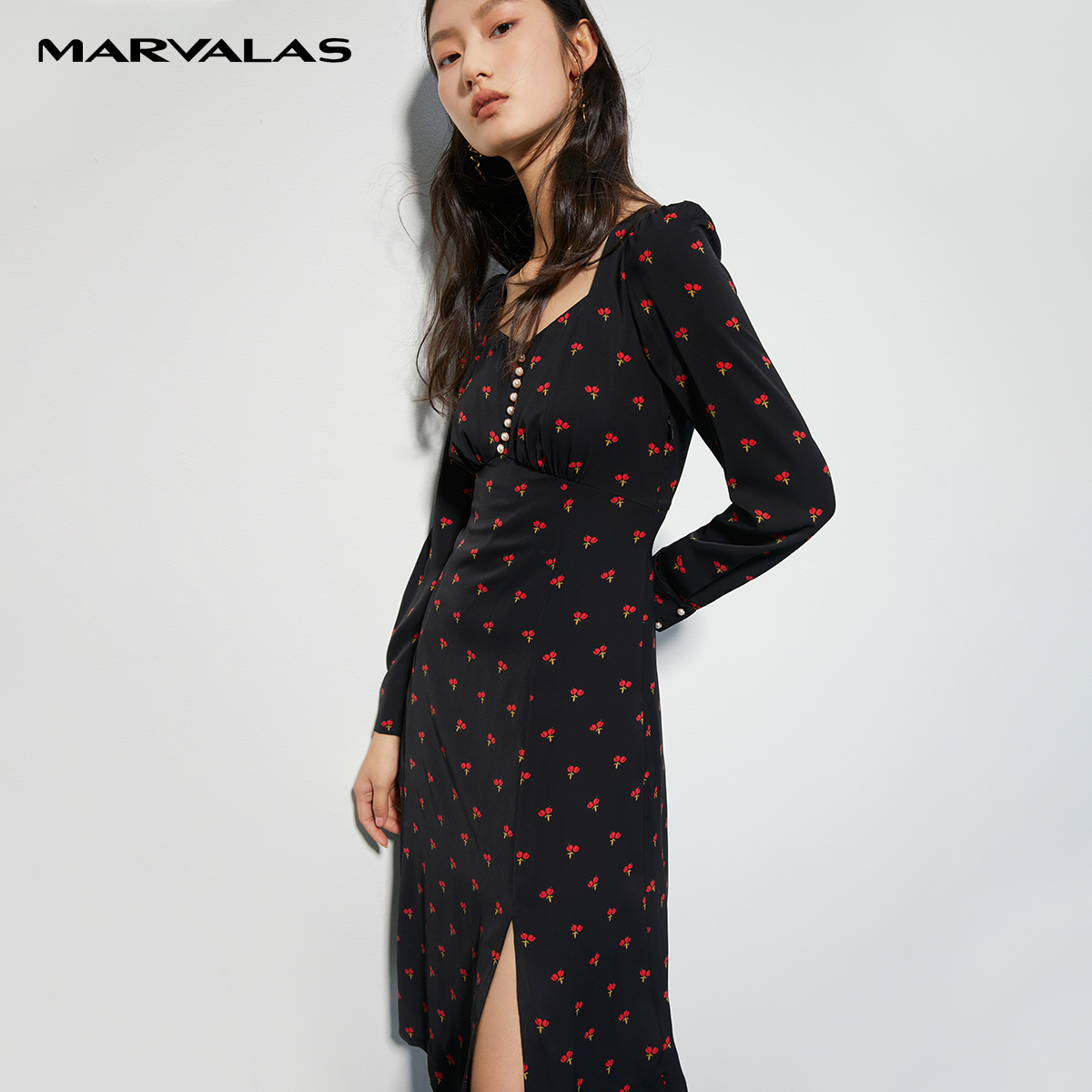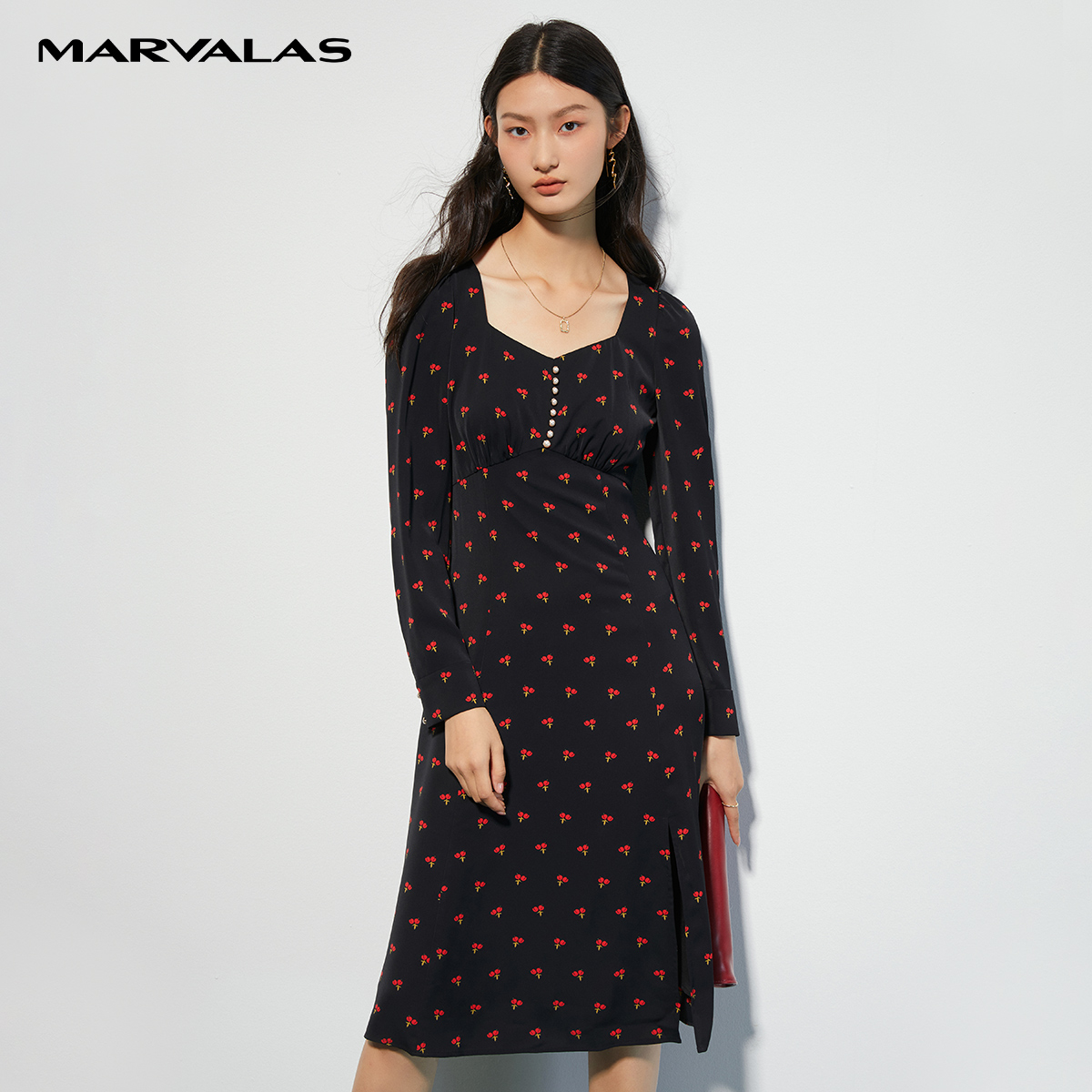 曼德诗黑红花下摆开叉长款连衣裙2025秋季温柔樱桃印花气质长裙