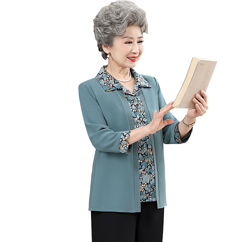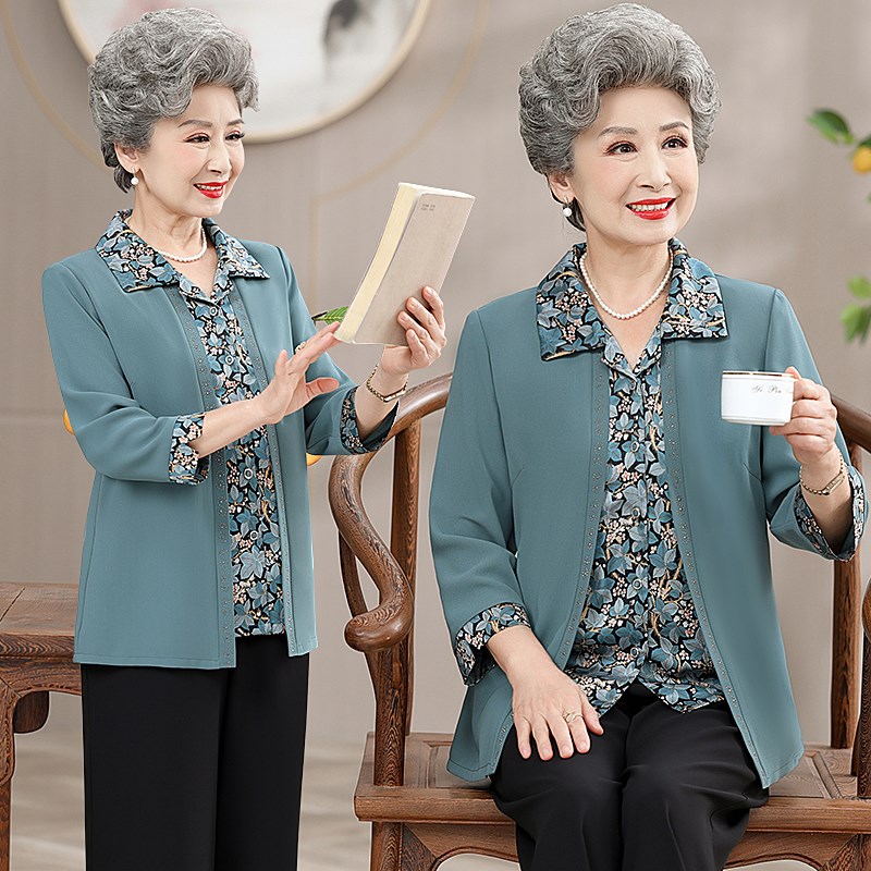 老年人夏装女奶奶装假两件套上衣薄款妈妈春秋衬衫70岁80老人衣服