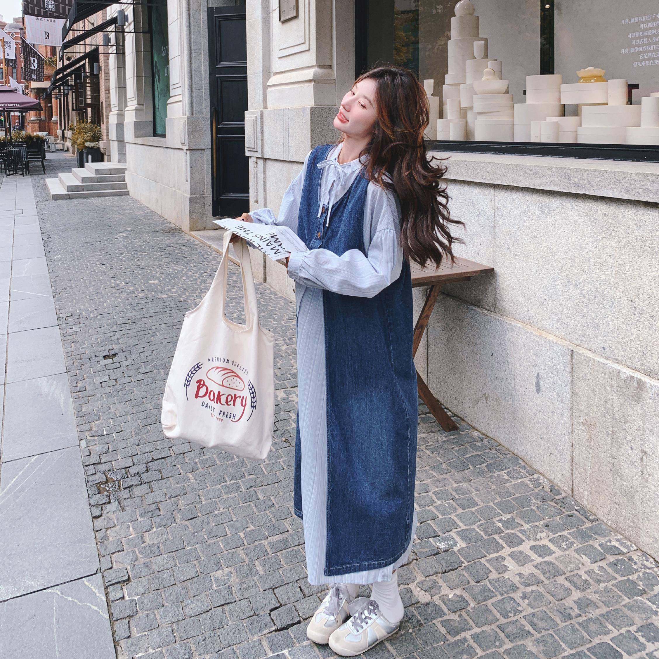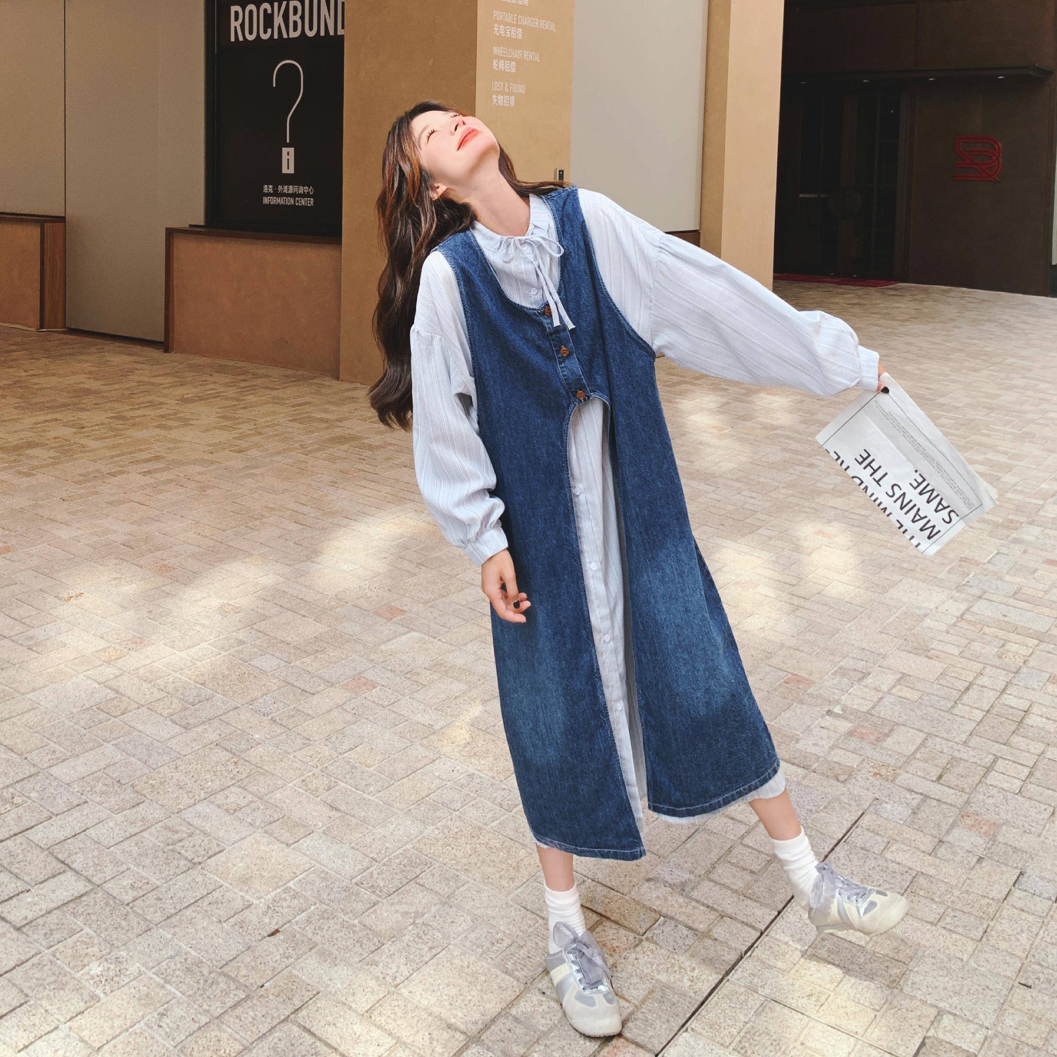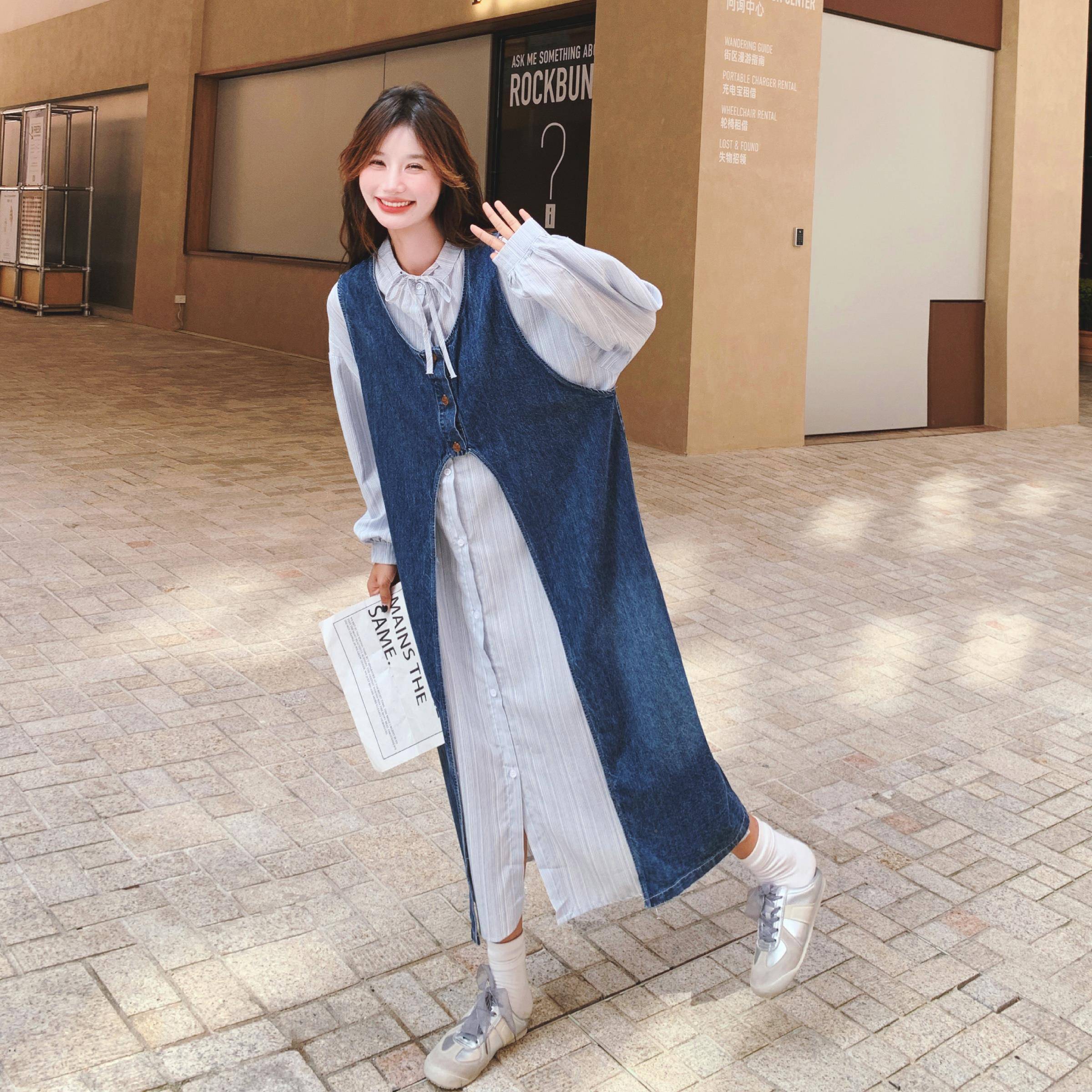 院风条纹衬衫春连衣裙套装女学秋穿xt搭2052新款牛仔罩衫叠穿一整