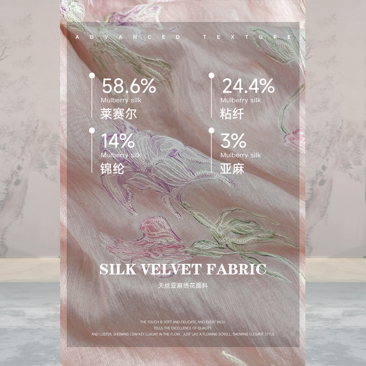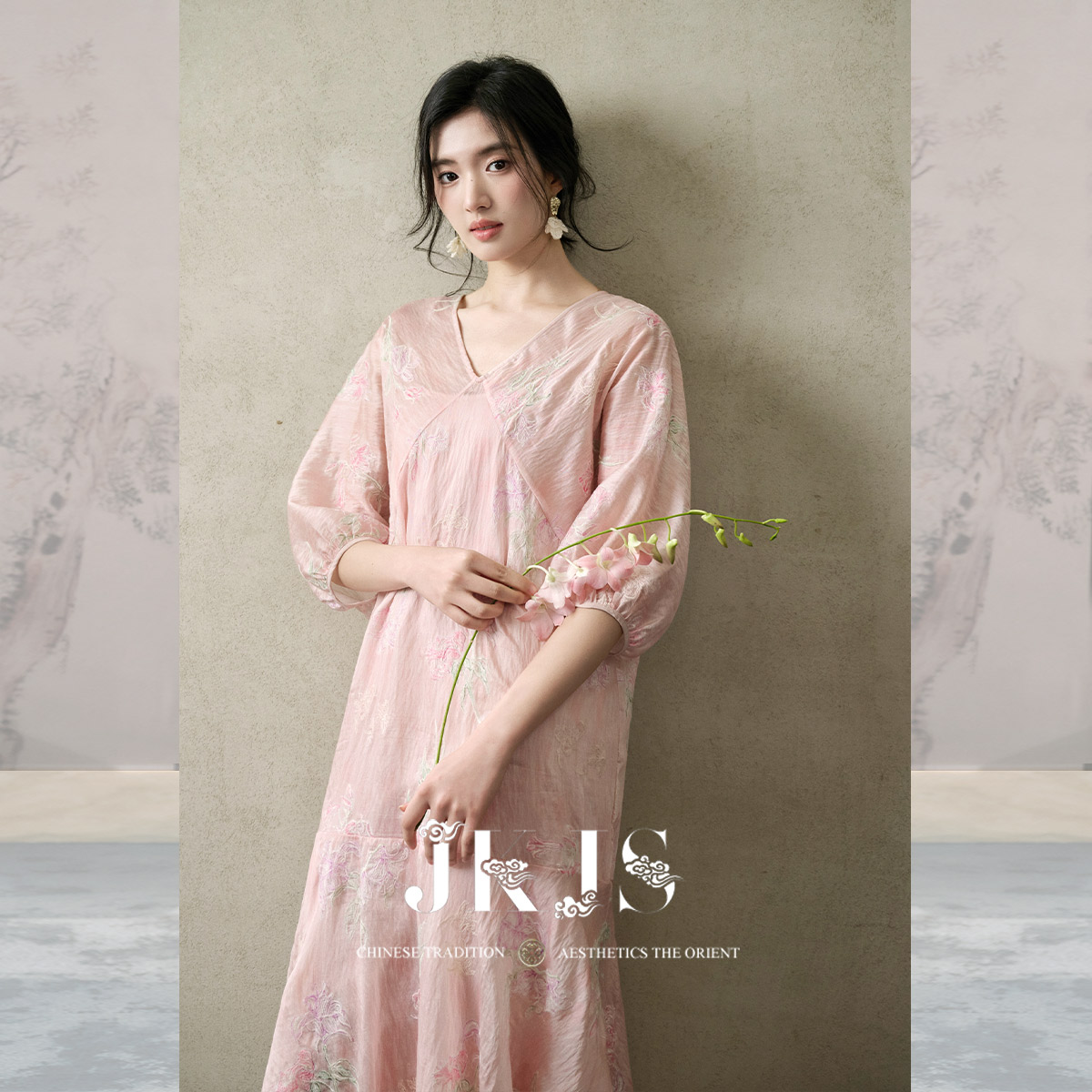 JKJS【兰苕春】天丝亚麻绣花夏季连衣裙新中式V领灯笼袖气质长裙