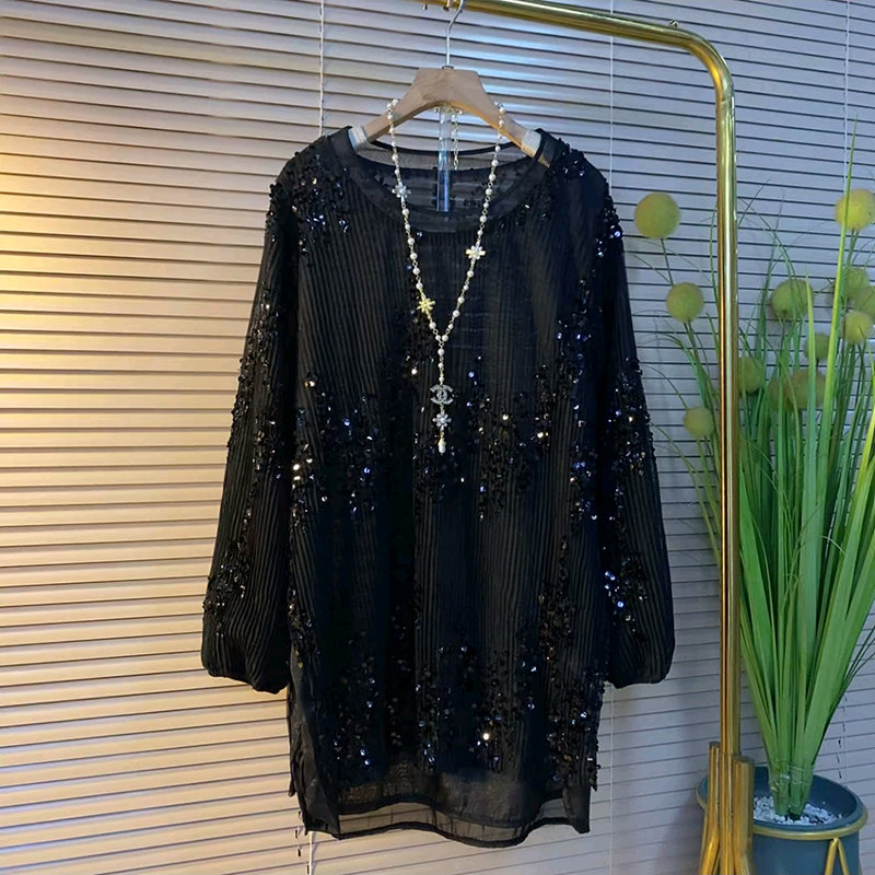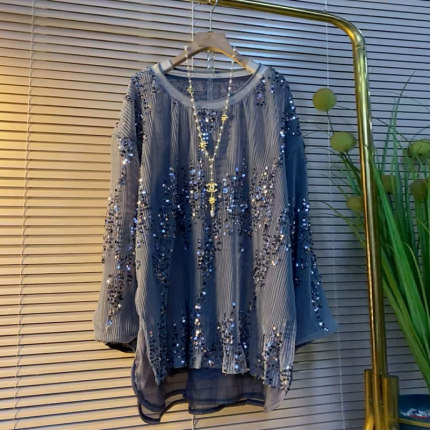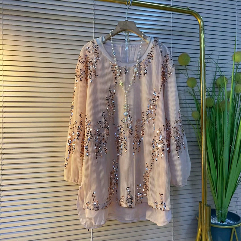 新款大码女装圆领长袖亮片大衫