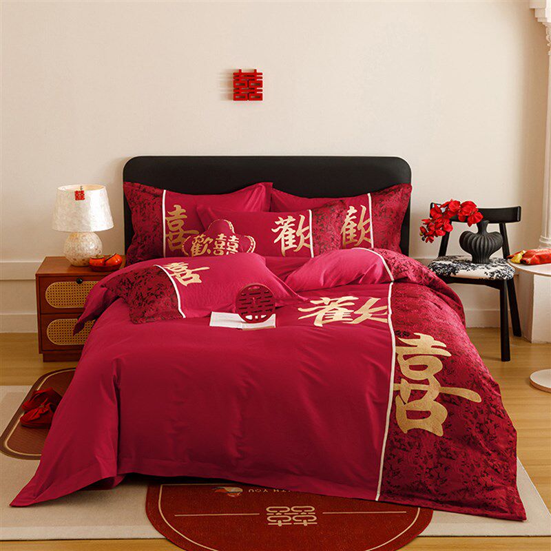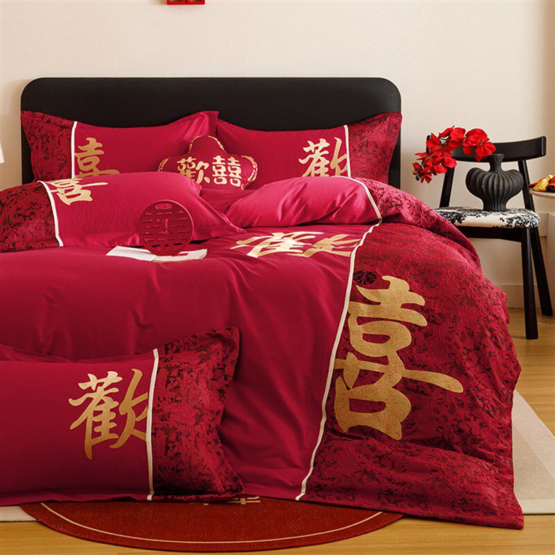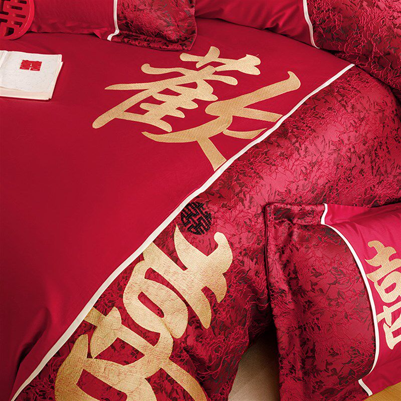 高档新中式红色结婚四件套婚庆纯棉刺F绣被套床单新房婚嫁喜被床