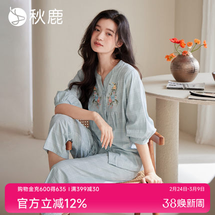 秋鹿莫代尔睡衣女士V领显瘦提花七分灯笼袖2026春新款家居服套装