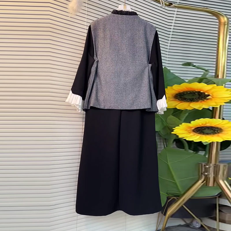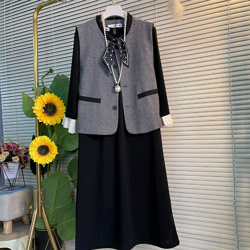 加大码女装系带领马甲拼色袖口连衣裙胖妹妹气质通勤风显瘦两件套