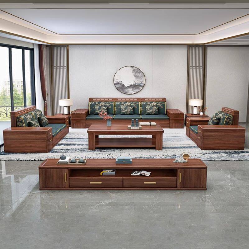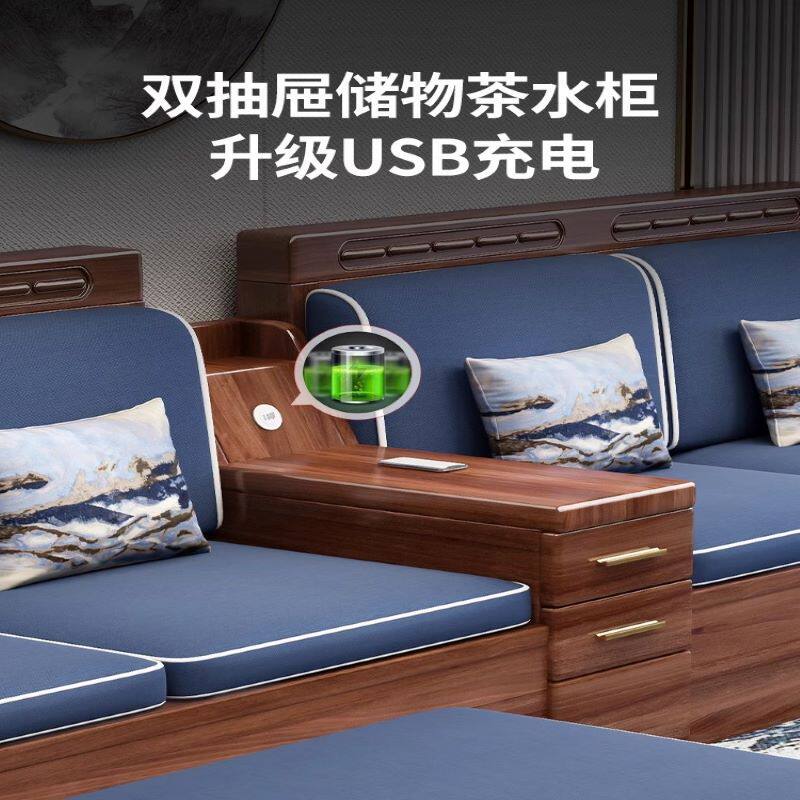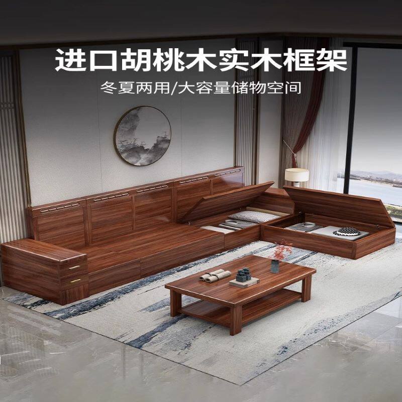 新中式胡桃木实木沙发转角贵妃组合大小户型冬夏两用储物客厅家具
