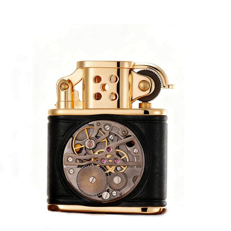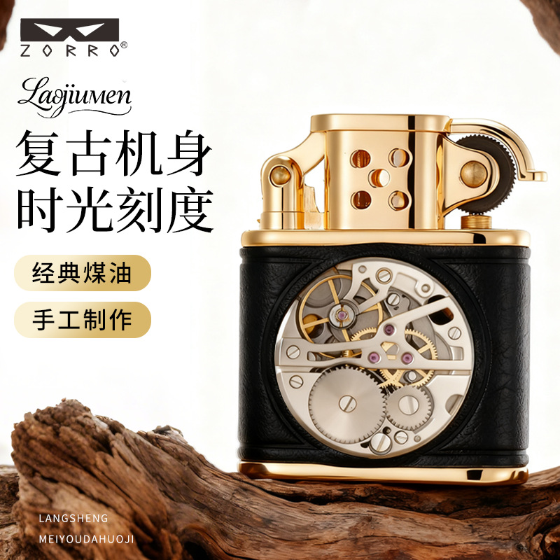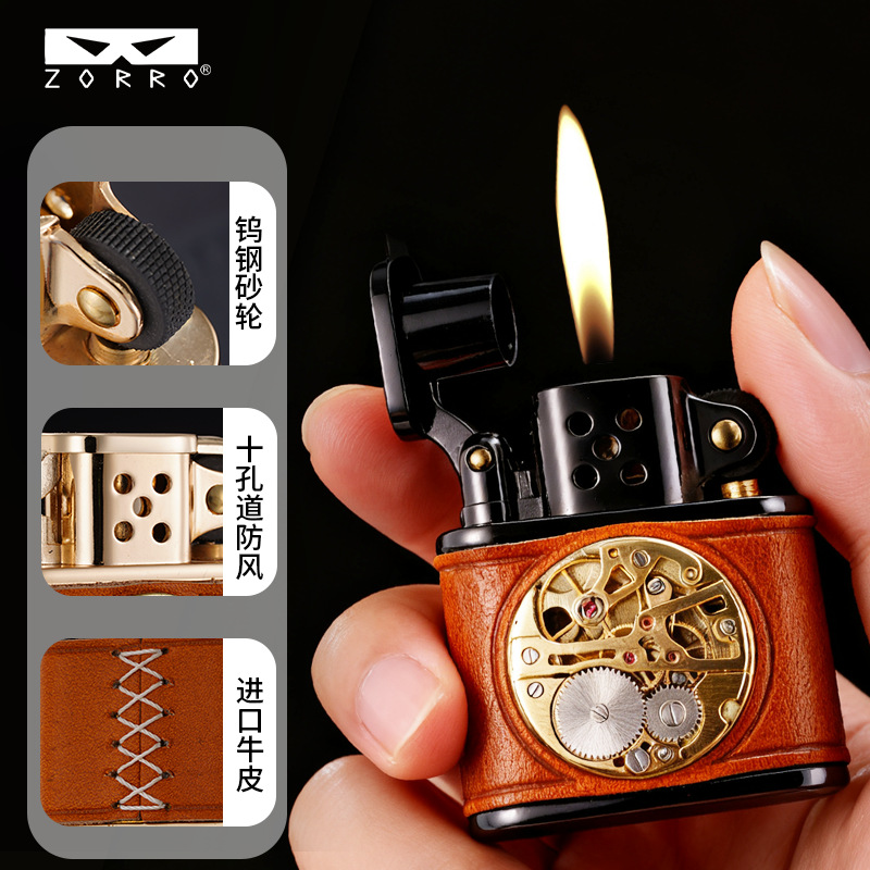 zorro佐罗正品砂轮煤油打火机铜壳二代老九门手工皮机械表盘轻奢