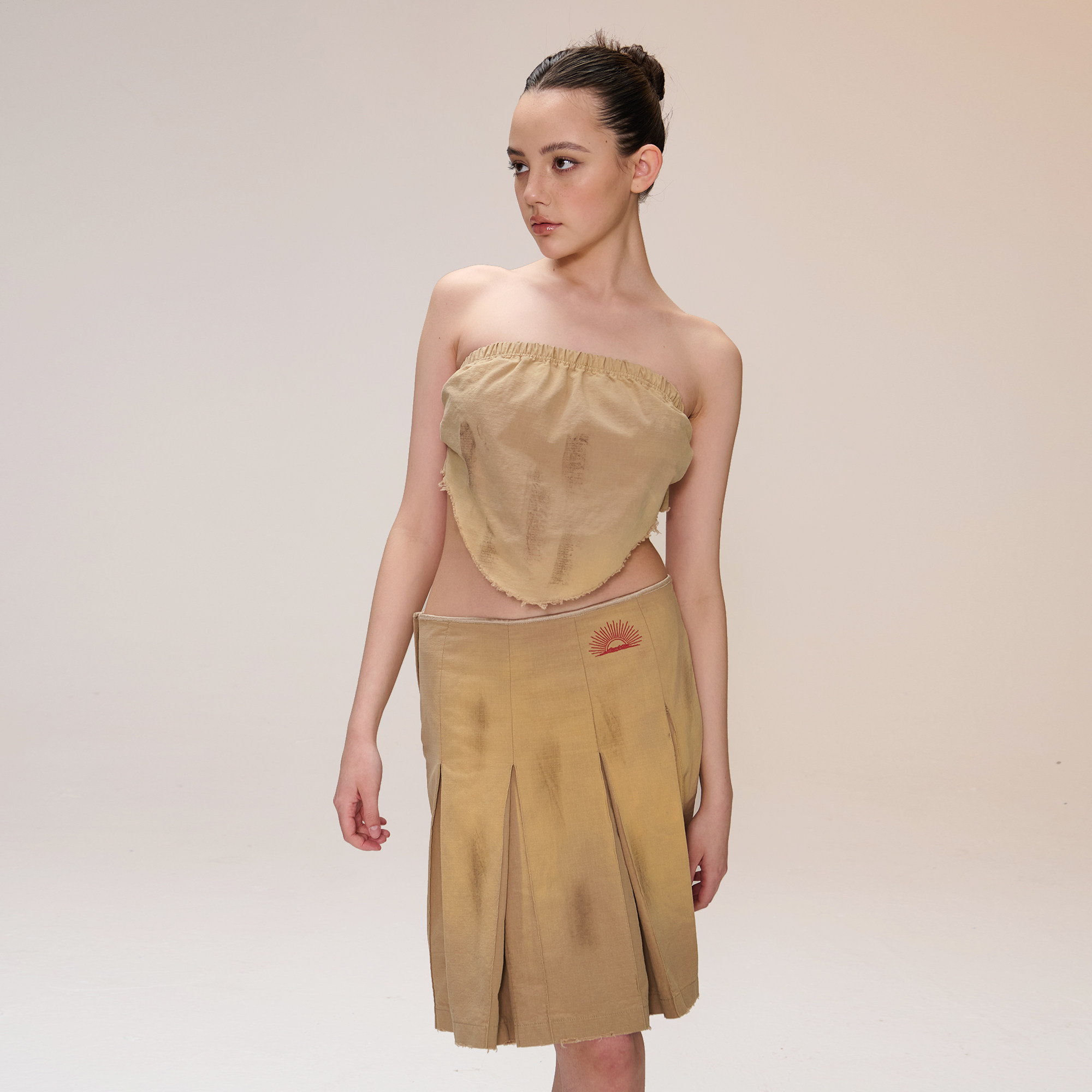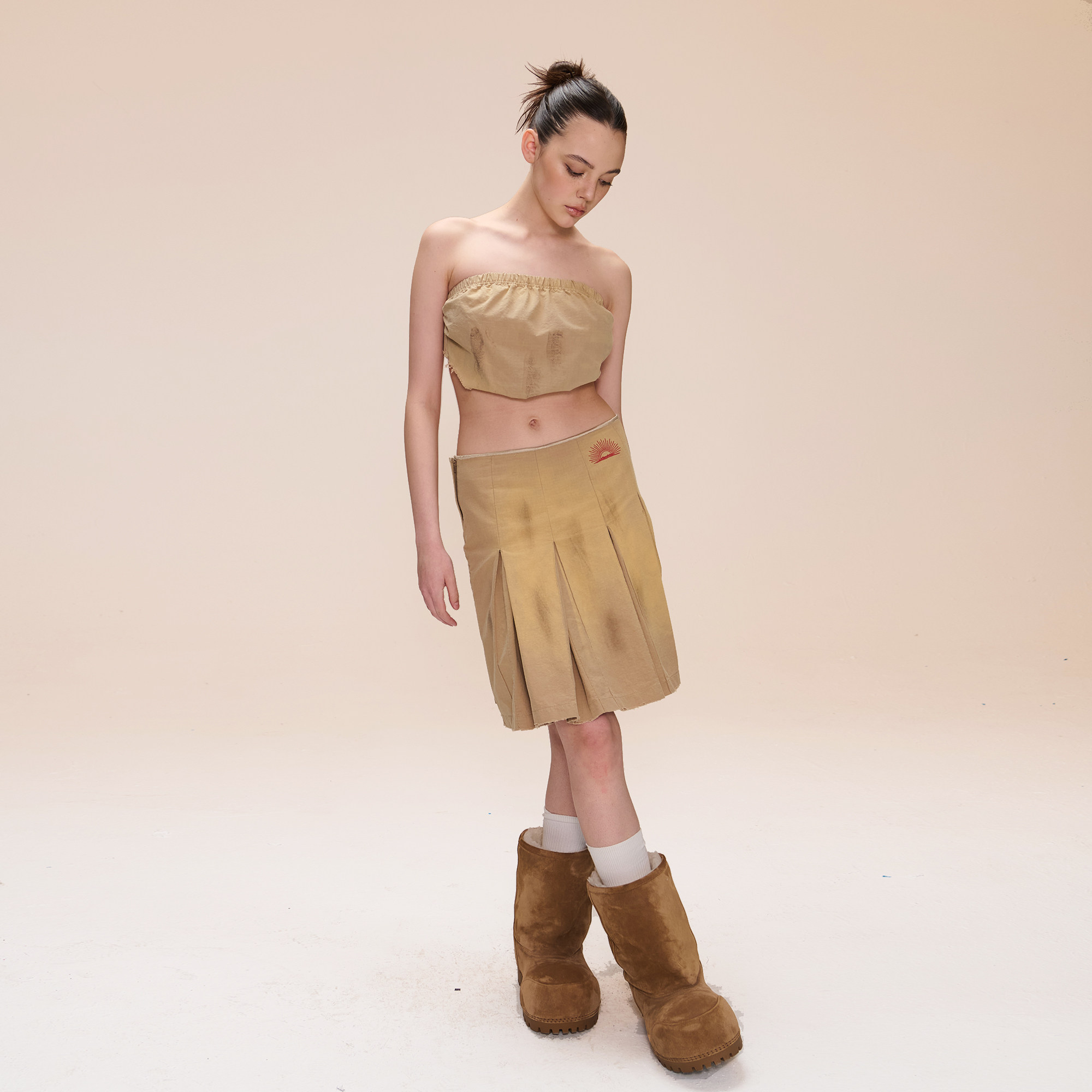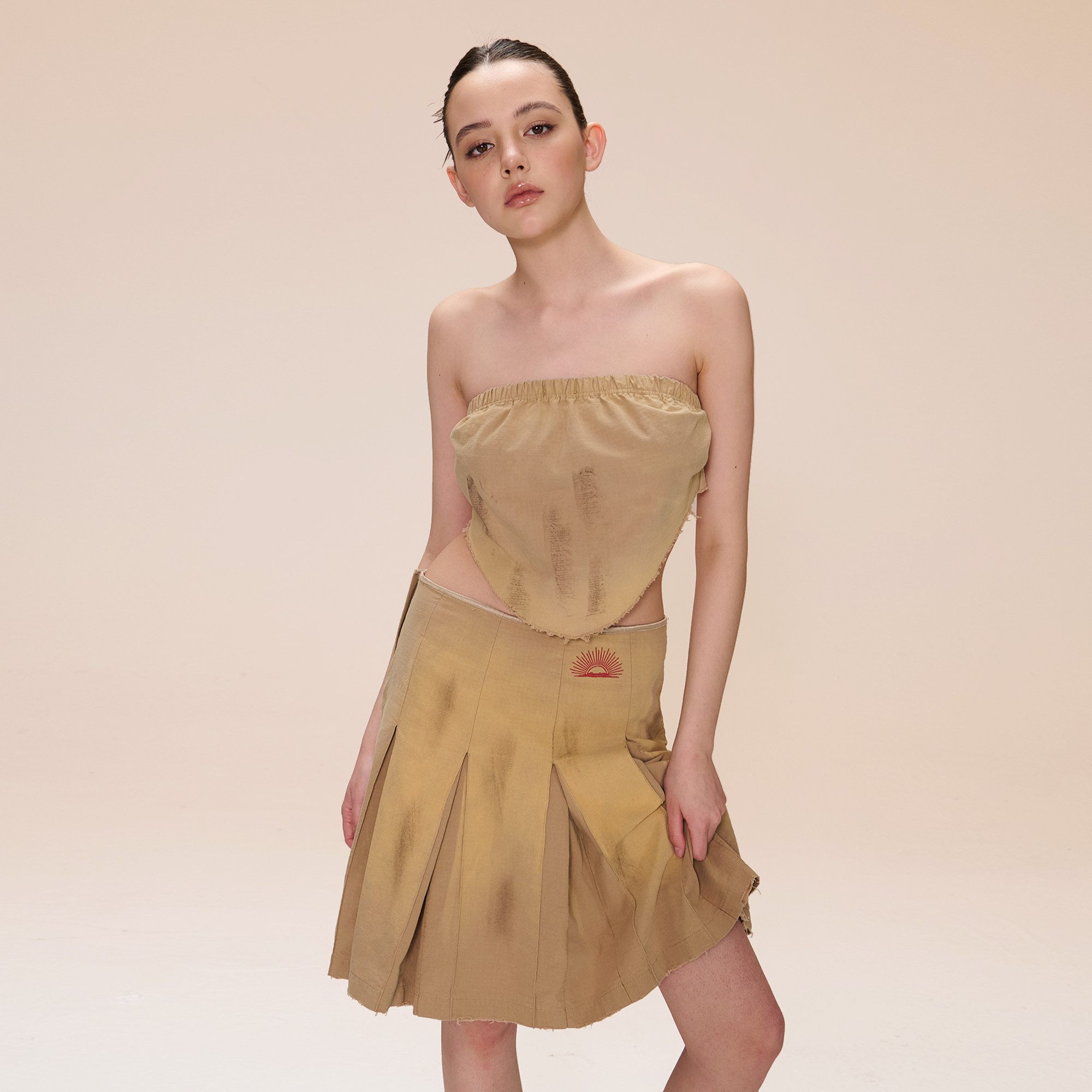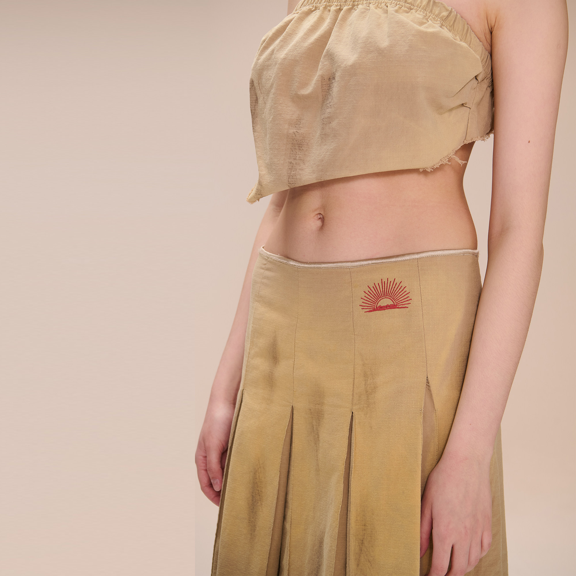 COZYDOLL巴恩风复古机车做旧脏染磨破毛边太阳刺绣百褶裙中裙